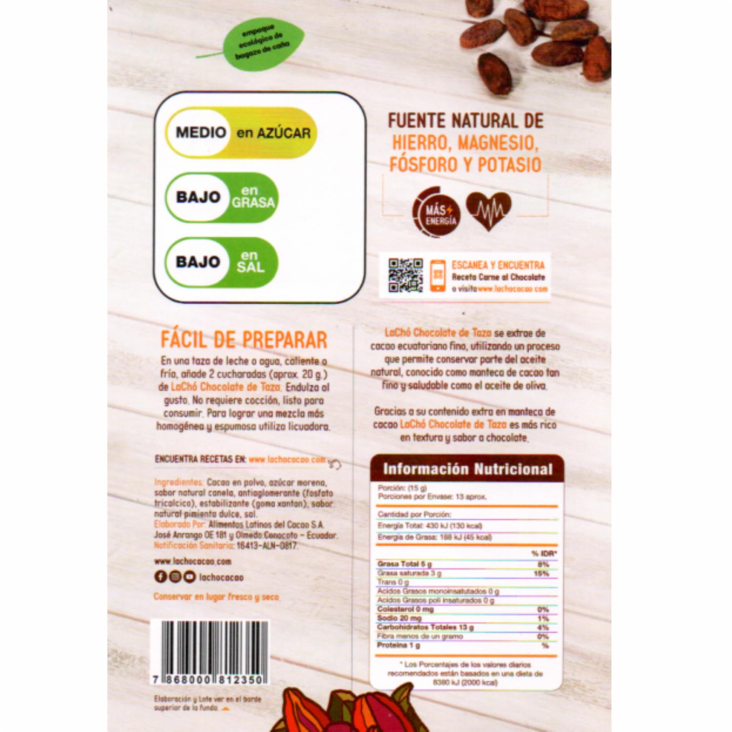 • Lachó Chocolate de Taza contiene 50% de cacao de Los Ríos. Aromatizada con canela y endulzada con azúcar morena. Aporta magnesio, hierro y fósforo. Listo para mezclar y consumir. No contiene harina de trigo ni almidone