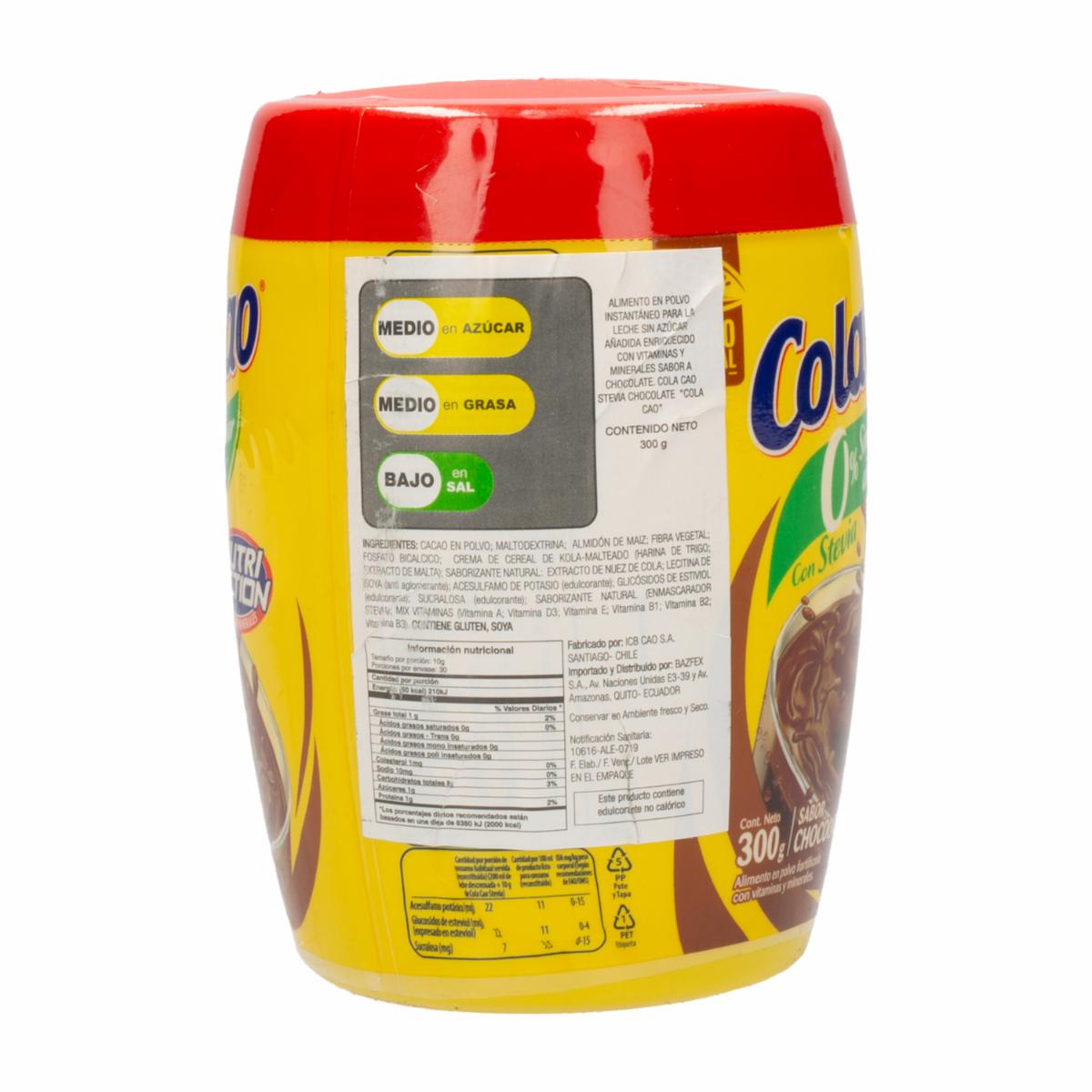 - El chocolate en polvo endulzado con stevia Cola Cao en su presentación de 300 gramos es una opción deliciosa y más saludable para quienes buscan disfrutar de un chocolate sin añadir azúcar. Este producto es ideal para preparar bebidas calientes, batidos o incluso para añadir a recetas de repostería
