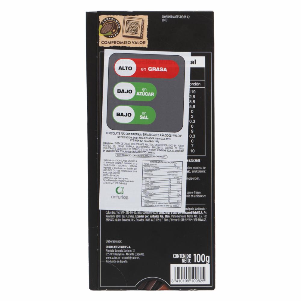 Chocolate Negro 0.7 Cacao/Naranja Sin Azúcar VALOR 100 G