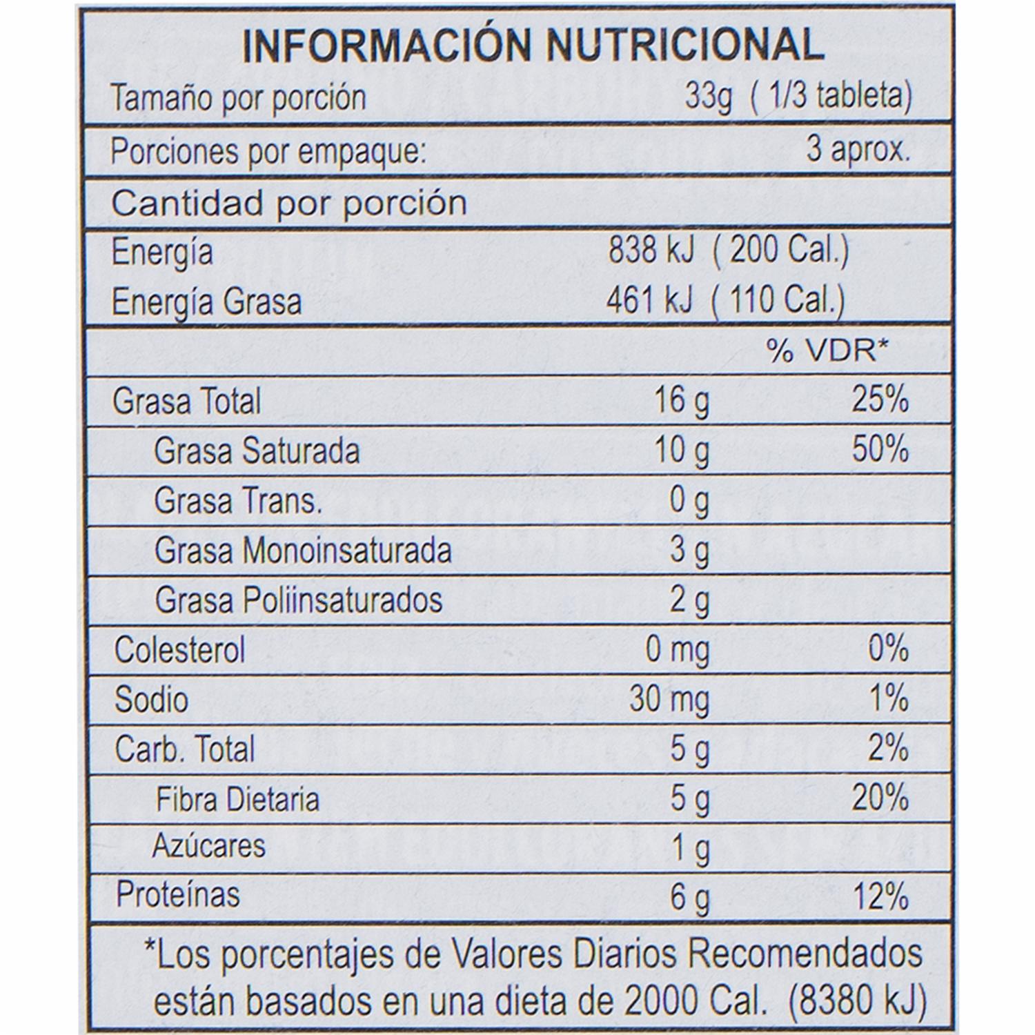 • Tableta de chocolate con alto porcentaje de cacao: Cacao 85% mínimo, sin azúcares añadidos, sin gluten
