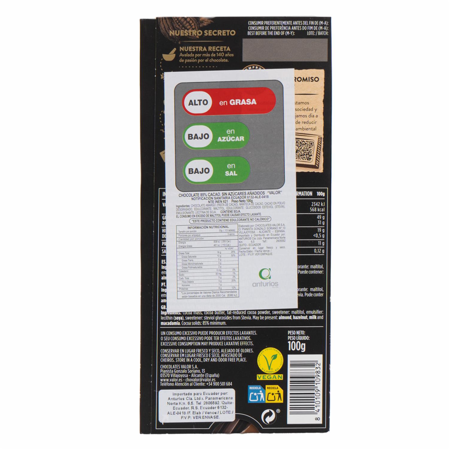 Chocolate Negro 85% Cacao Sin Azúcar VALOR Tableta