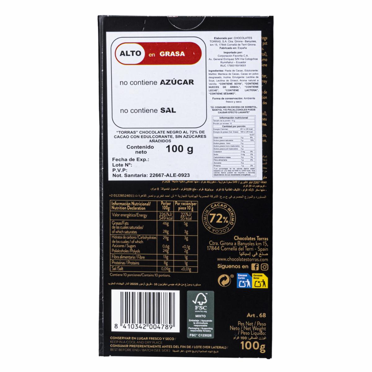 Chocolate Negro Al 72% De Cacao Sin Azúcar Añadida TORRAS 100 G