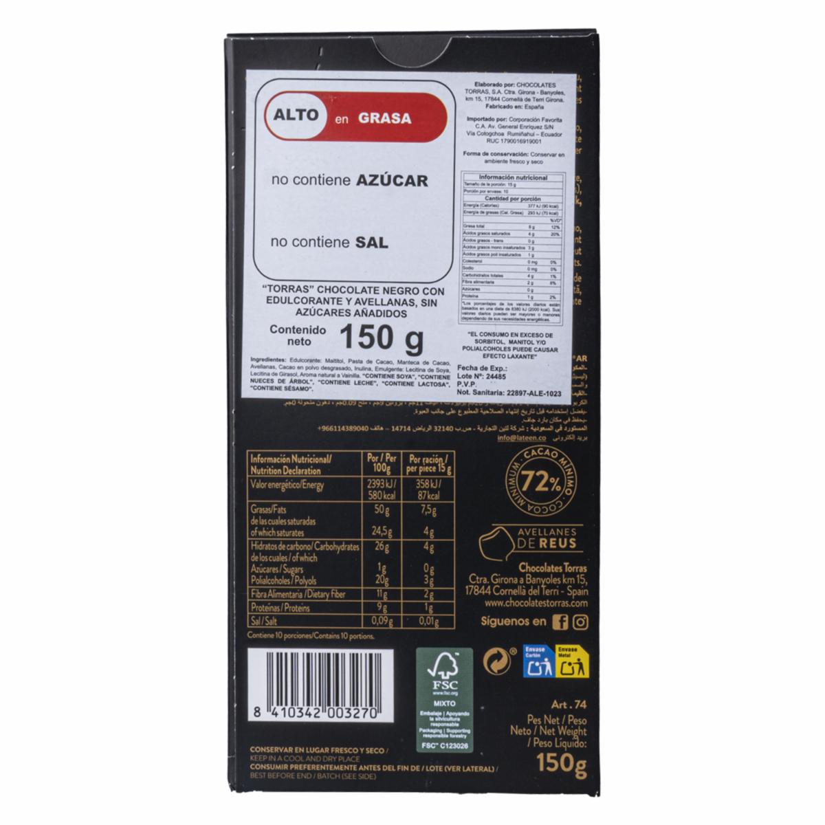Chocolate Negro Con Avellanas Sin Azúcar Añadida TORRAS 150 G