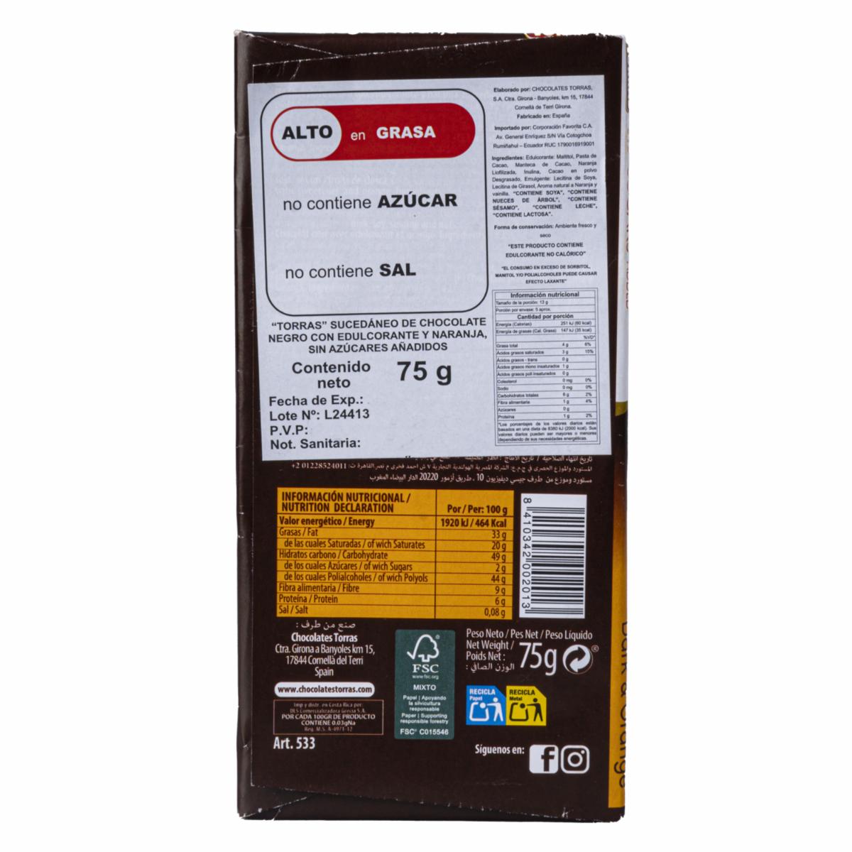 Chocolate Negro Con Naranja TORRAS 75 G