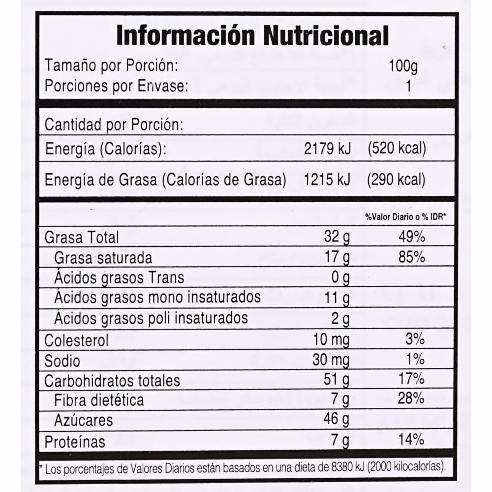 • Ingredientes: Azúcar, pasta de cacao, almendras (7%), manteca de cacao, grasa láctea anhidra, naranja (2%), manzana, piña, emulgente (lecitina de soja), aroma natural de naranja, acidulante (ácido cítrico), espesante (alginato sódico, fosfatos de calcio), aroma (vainilla)