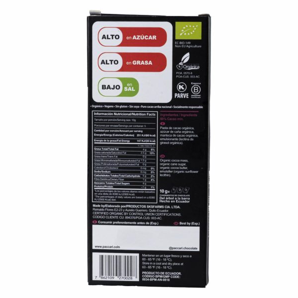 Chocolate Orgánico Esmeraldas 60% PACCARI Tableta