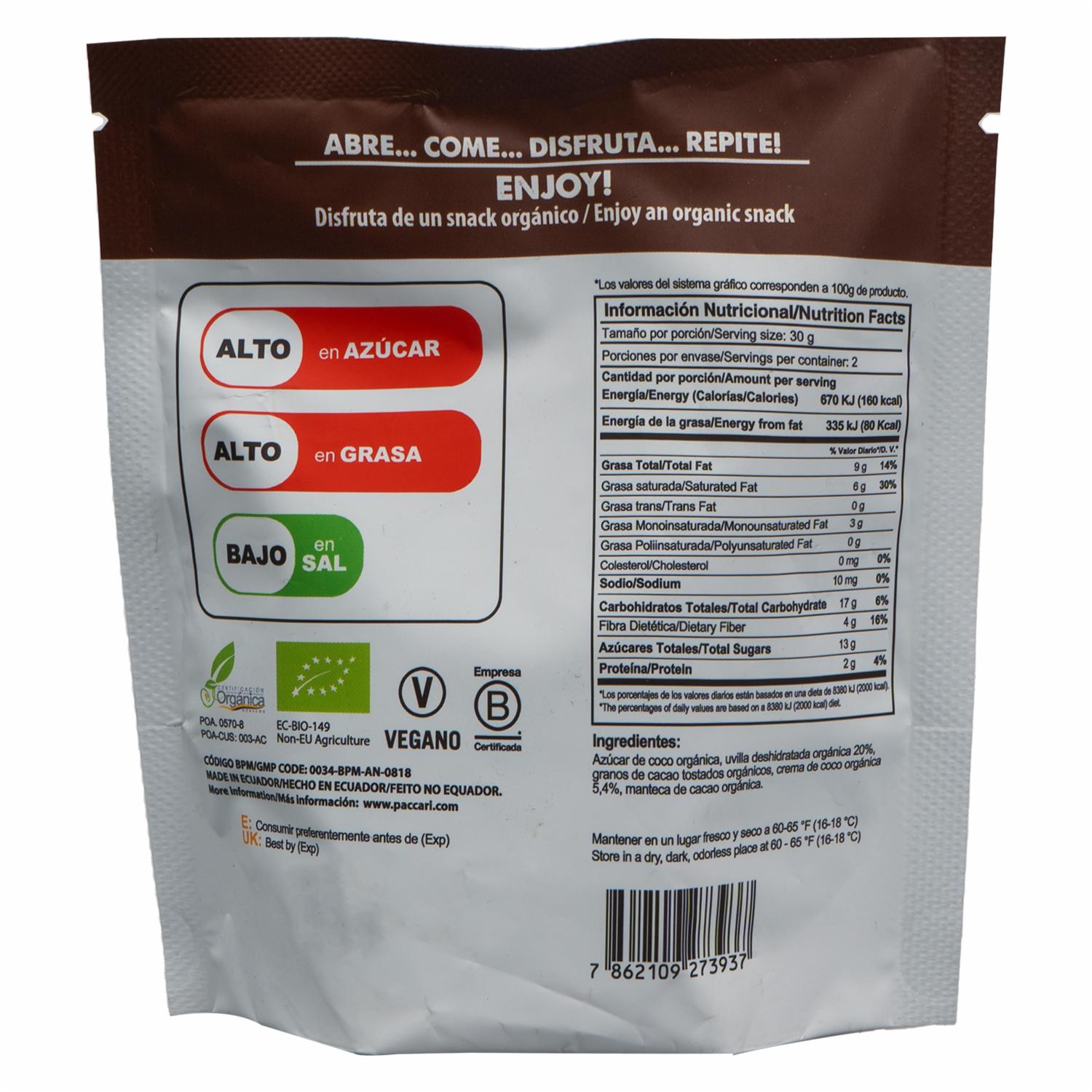 consultando preciosChocolate Orgánico Uvillas Chocolate Y Crema De Coco PACCARI 60 G – PACCARI. Disponible en nuestros locales. Precio y stock pueden variar según la tienda.