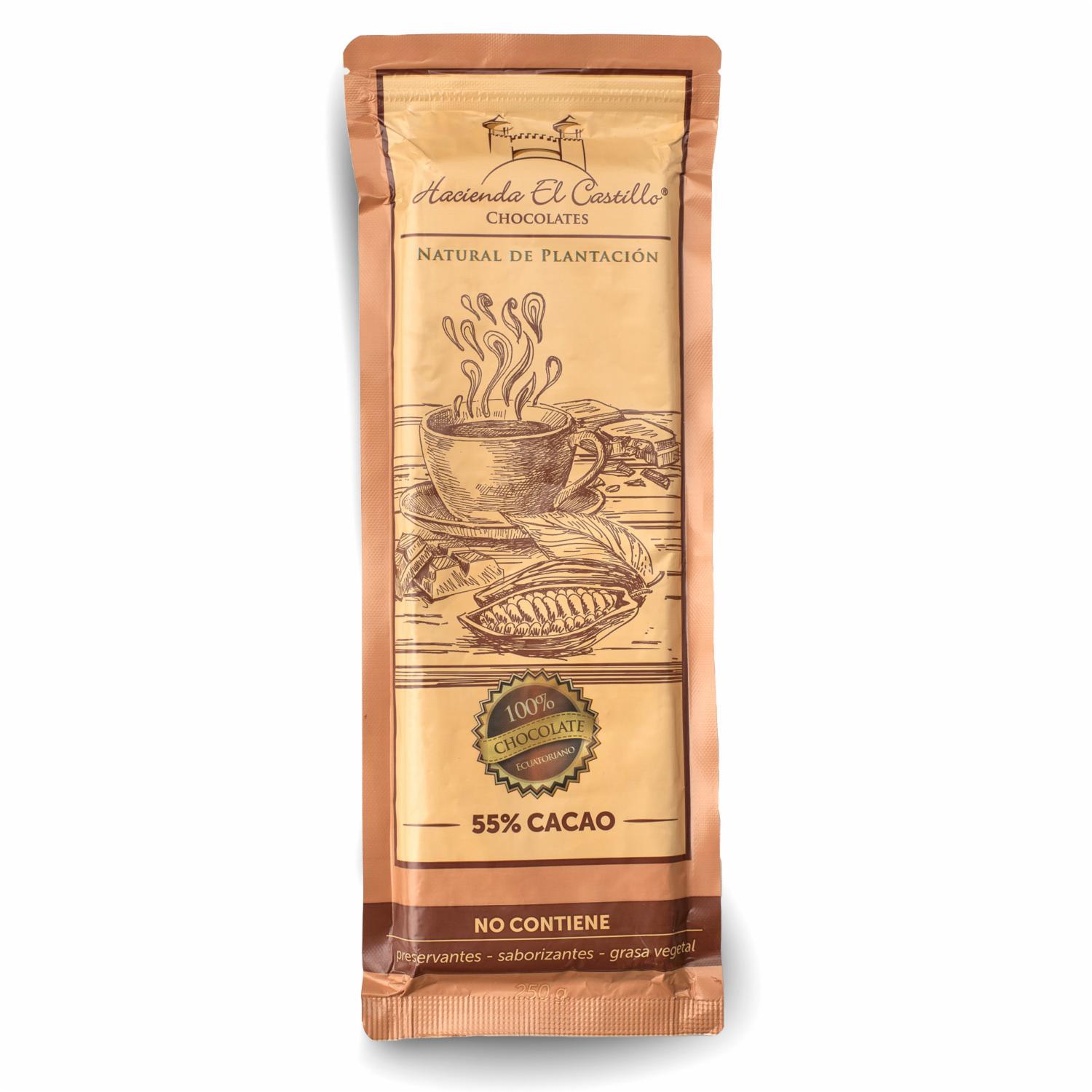 • 100% Chocolate Ecuatoriano, Elaborado Con Una Concentración Del 55% De Cacao. Hecho En Hacienda El Castillo Desde Desde El Vivero, Plantación, Cosecha, Fermentación Secado Y Fabricación. Para Su Elaboración Se Usan Productos Naturales. No Contiene Preservantes, Saborizantes Ni Grasa Vegetal