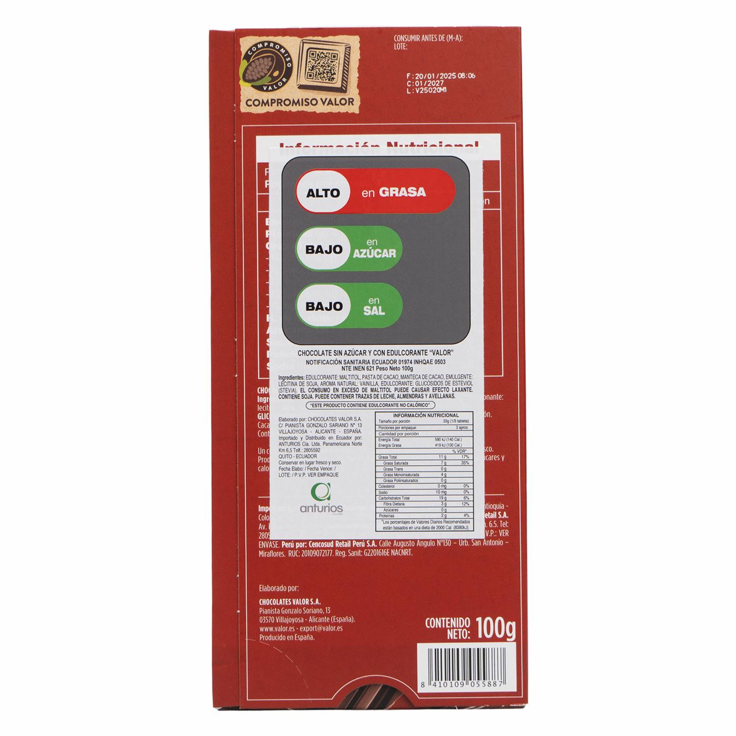 Chocolate Puro Sin Azúcar VALOR 100 G – VALOR. Disponible en nuestros locales. Precio y stock pueden variar según la tienda.