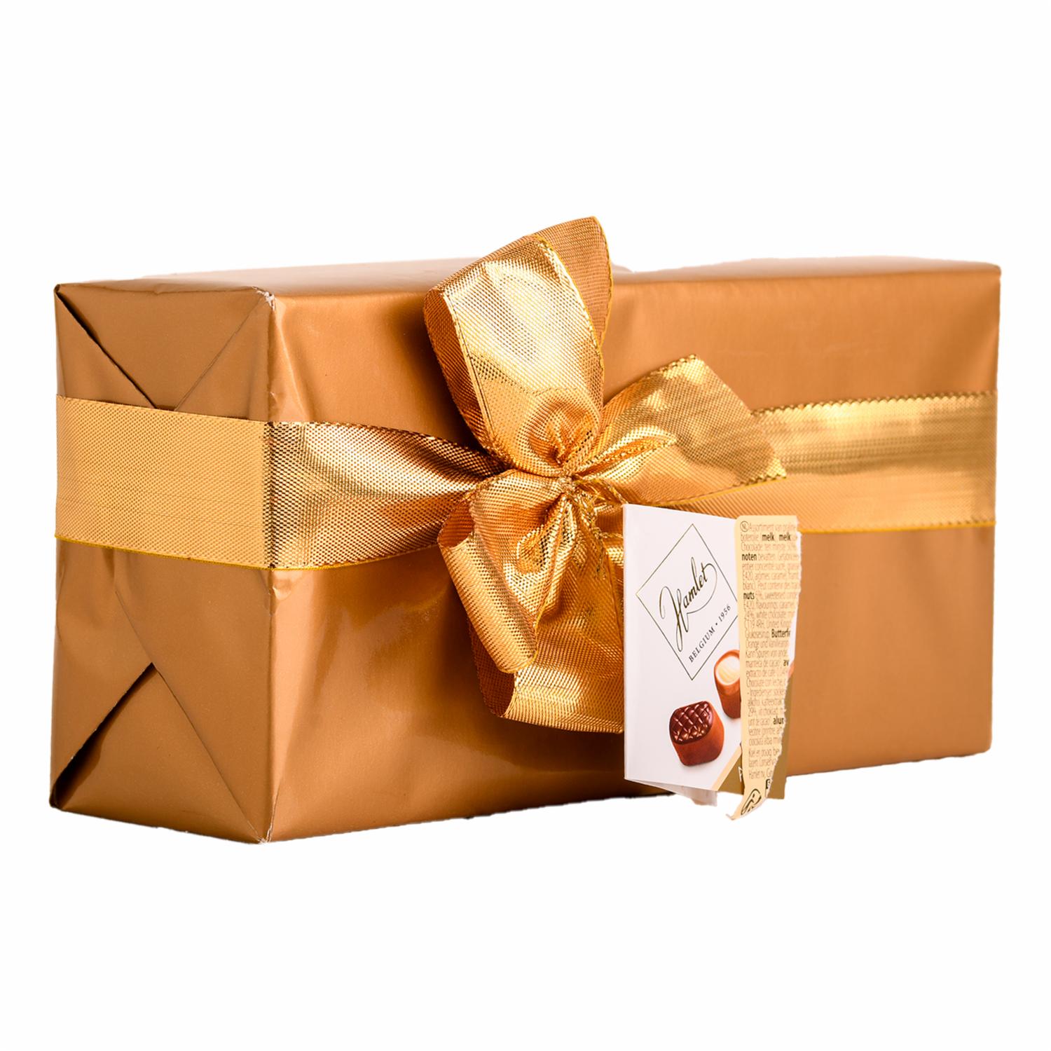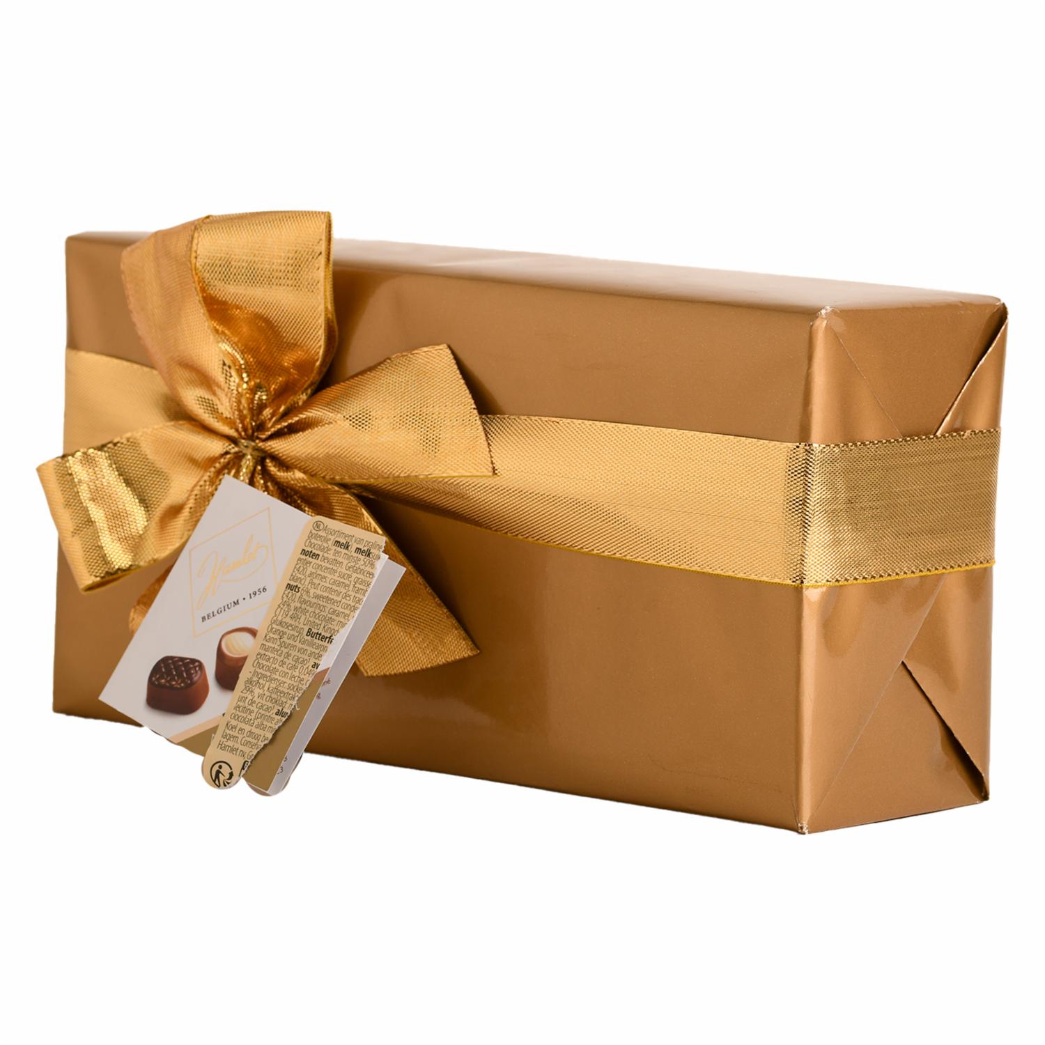 - Chocolates empacados en una lujosa caja envuelta para regalo con una cinta atada a mano