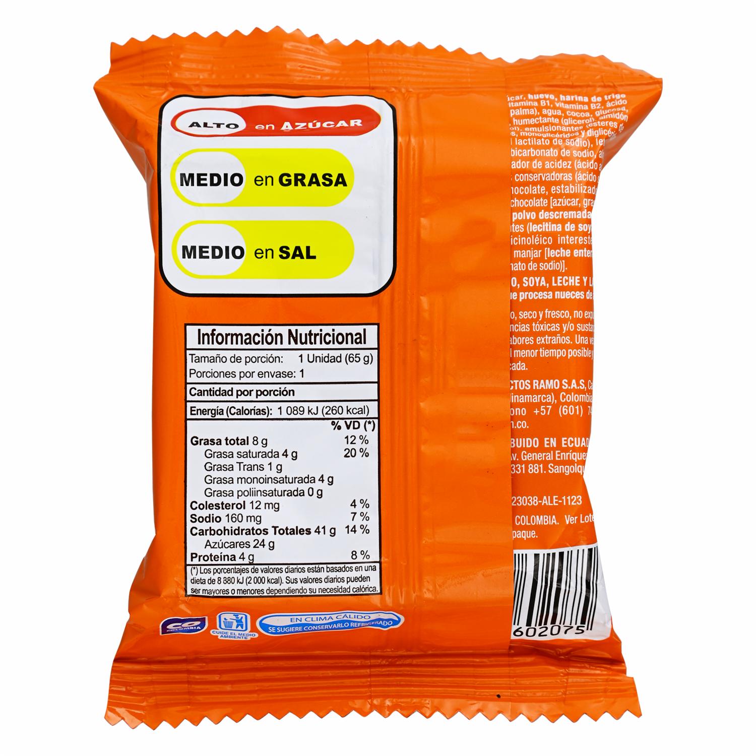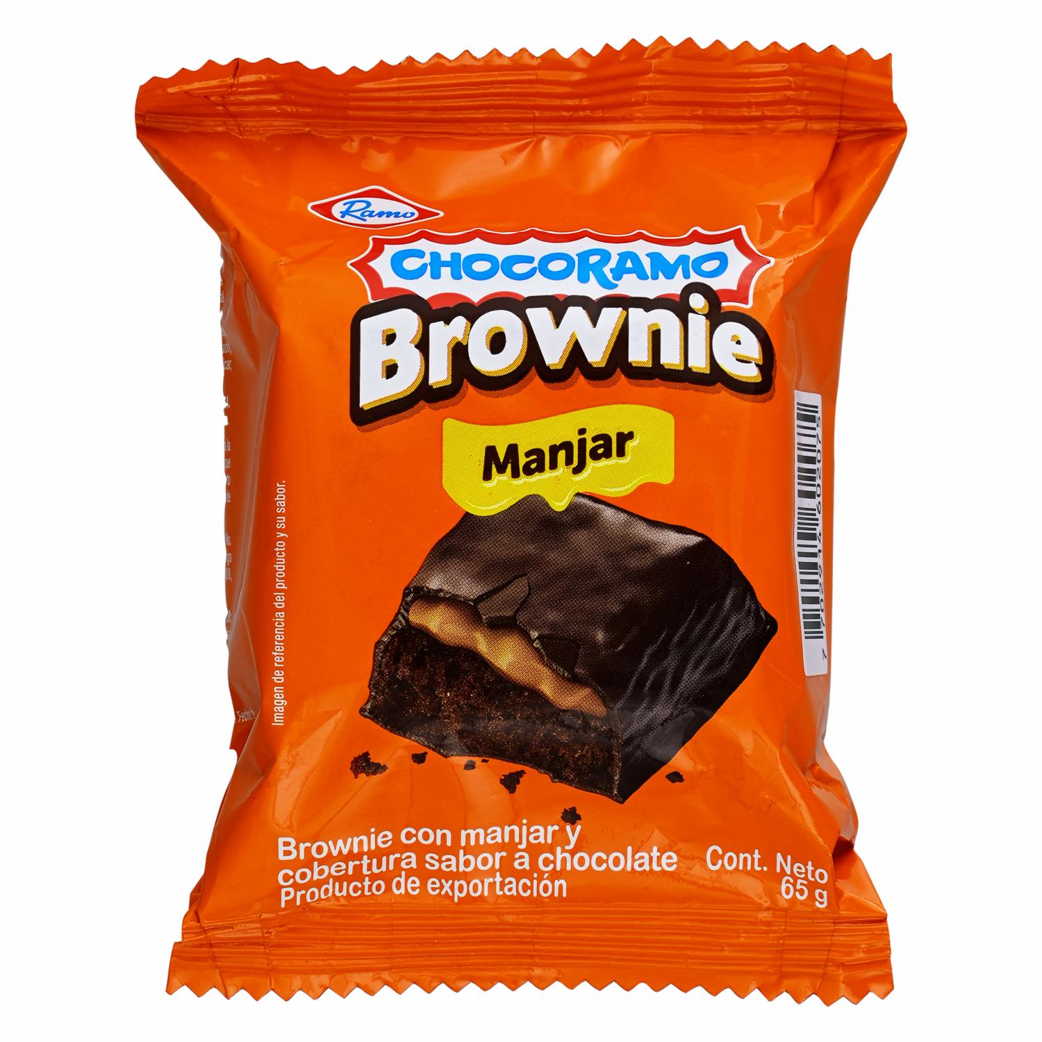 Brownie con Arequipe RAMO CHOCORAMO 65g. Delicioso brownie suave con un relleno de arequipe, que combina lo mejor de lo dulce y cremoso en un solo bocado. Ideal para disfrutar como snack o postre en cualquier momento del día