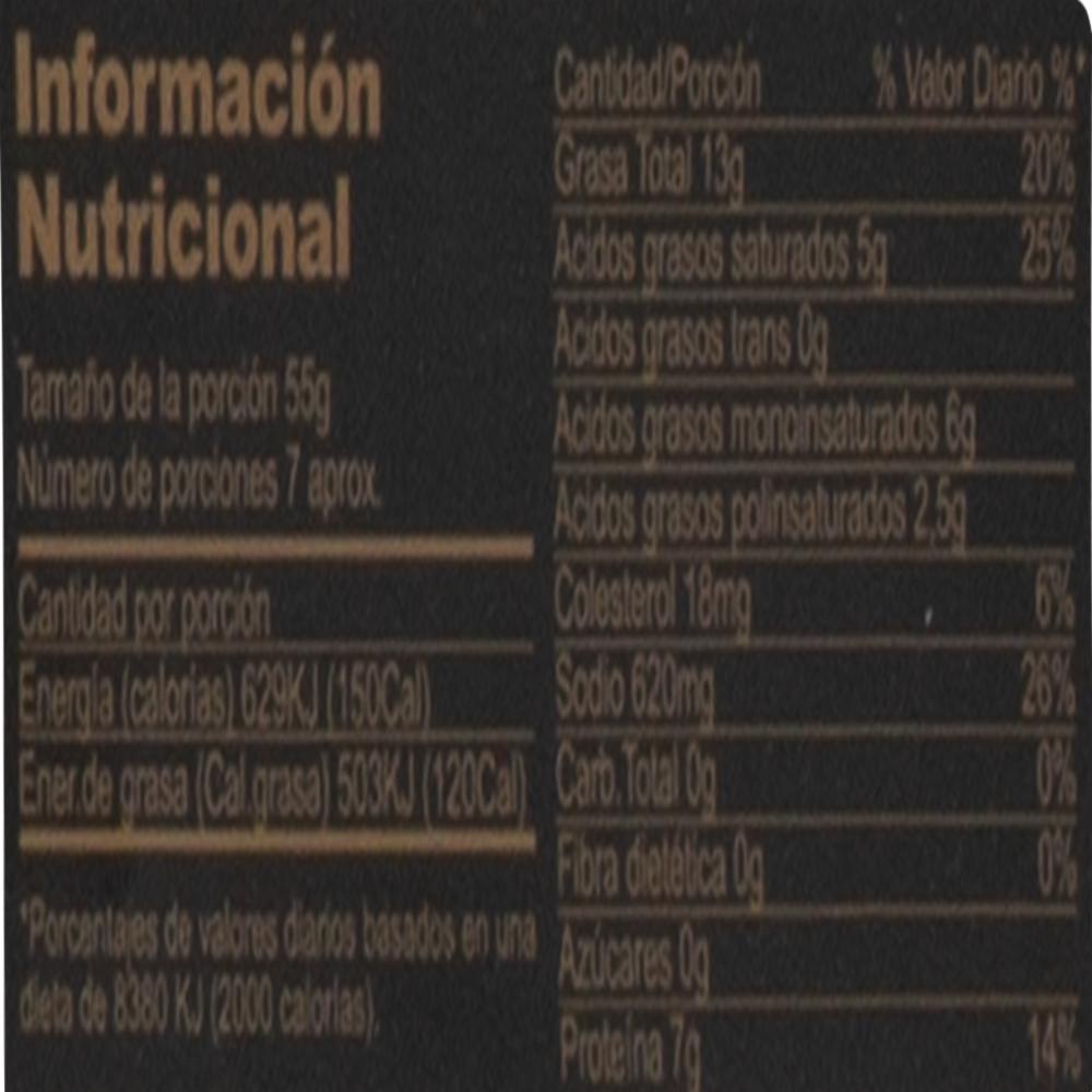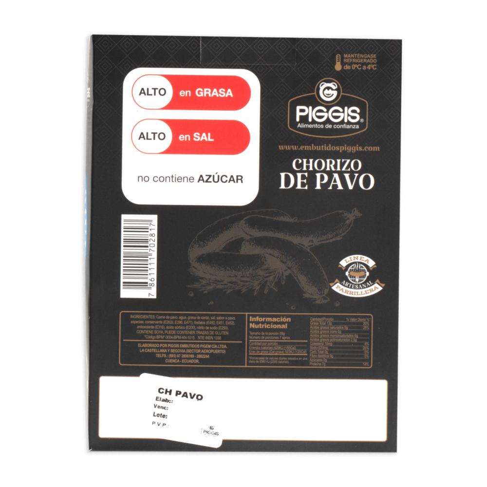 Carne de pavo, agua, sal, grasa de cerdo, especias, contiene soya, contiene gluten. Preparación: sartén y parrilla