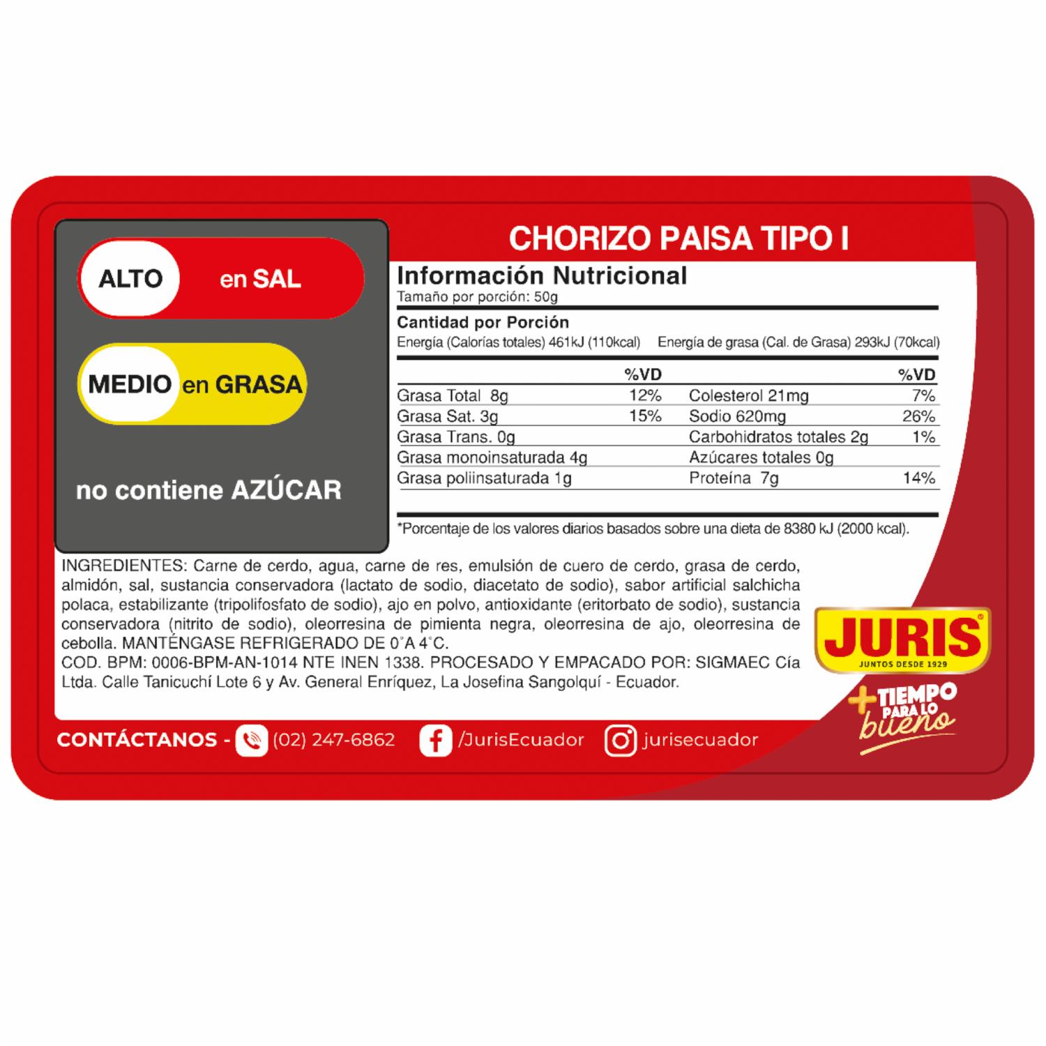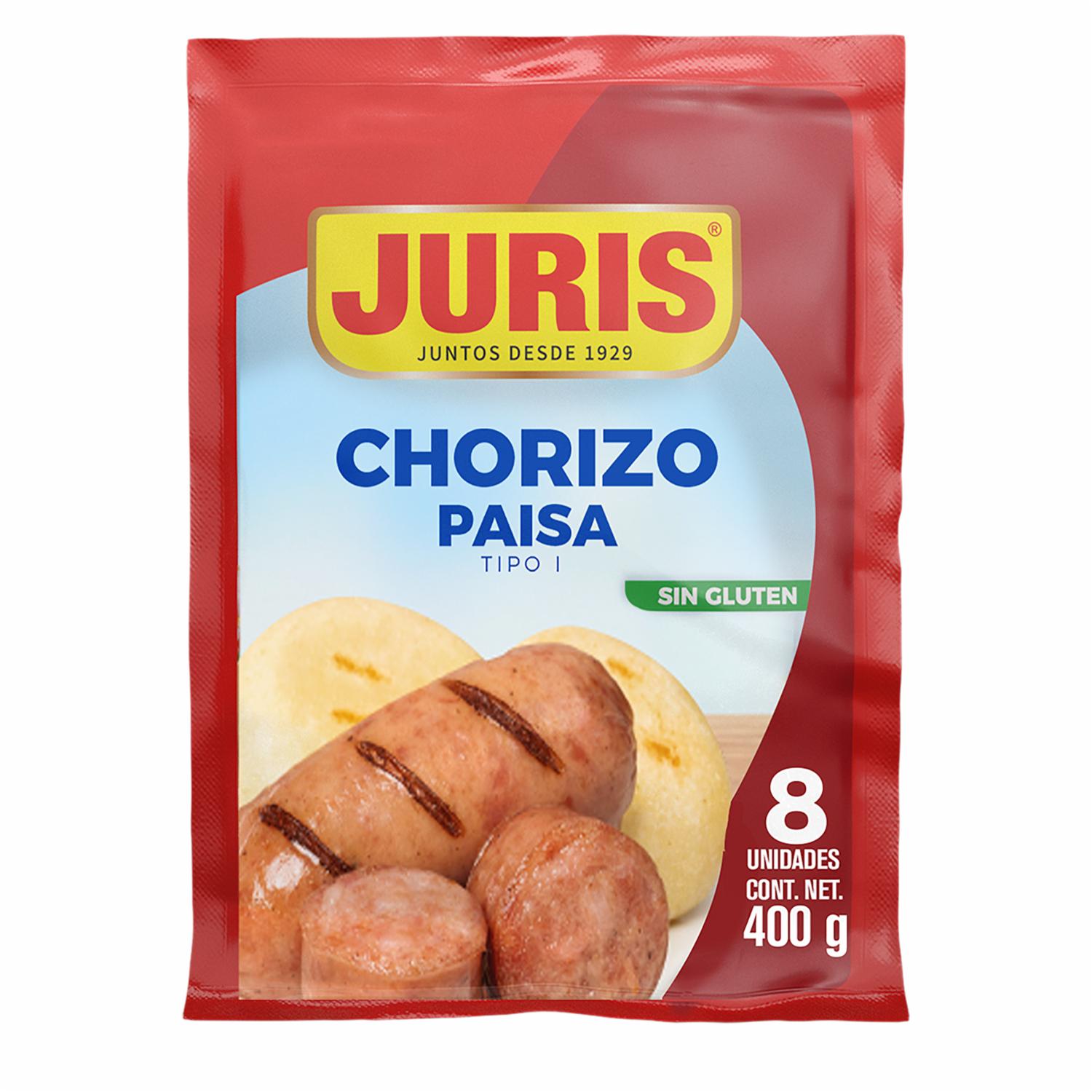 consultando preciosChorizo Paisa Tipo I JURIS 400 G – JURIS. Disponible en nuestros locales. Precio y stock pueden variar según la tienda.