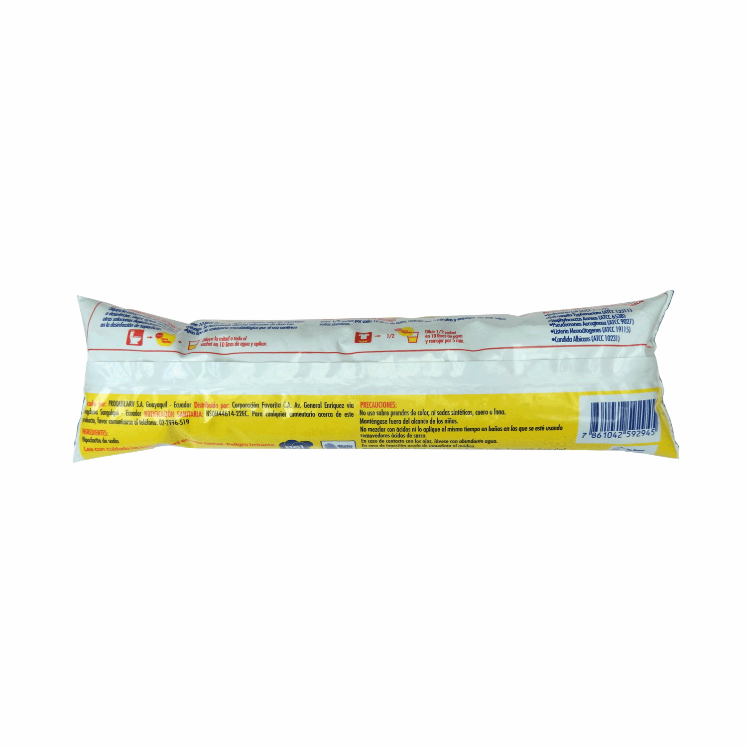 - Desinfección rápida y eficaz, eliminando el 99,99% de bacterias. Blanquea la ropa blanca y de algodón. Desodoriza al eliminar olores desagradables. Desmancha las superficies. Ideal para baños, pisos, ropa blanca y demás superficies lavables