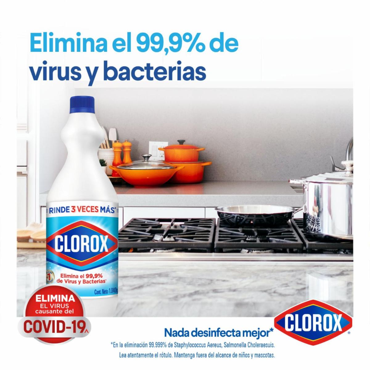- El Cloro Clorox Líquido elimina el 99.9% de bacterias y el virus SARS-CoV-2 causante del Covid-19. Gracias a su fórmula original y su ingrediente activo el Hipoclorito de Sodio, remueve manchas, limpia y desinfecta superficies grandes y pequeñas de tu hogar. Se debe utilizar según indicaciones para lograr una limpieza profunda en la cocina, baño, inodoros y las manijas de todas las puertas de la casa