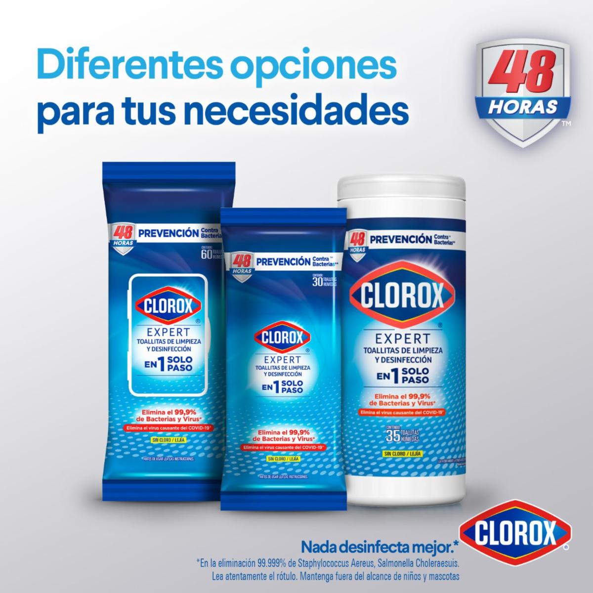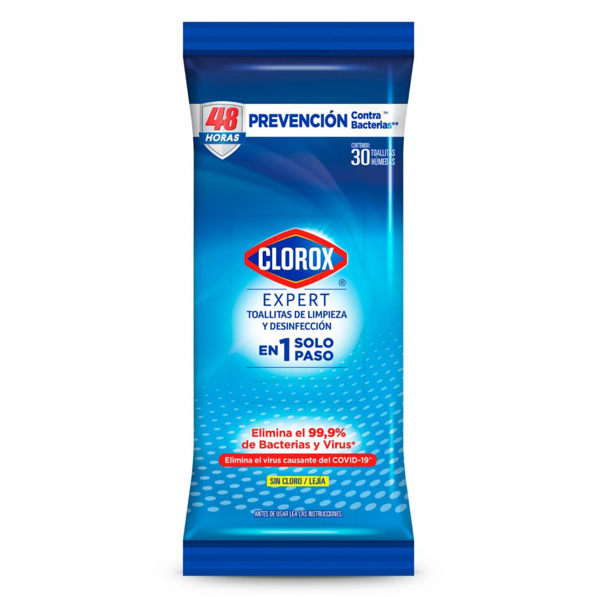 - Además, brindan 48 horas de prevención contra las bacterias. Su fórmula única no deja residuos, por lo que podrás desinfectar objetos como tu celular o tablet y hasta el carrito de compras en el supermercado. Confía en Clorox Expert