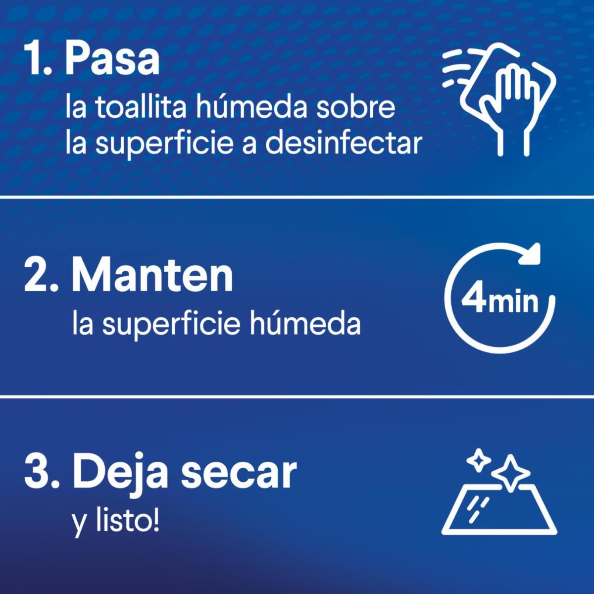 - Los organismos dañinos que suelen estar en múltiples superficies de tu hogar y en objetos de uso cotidiano, podrán ser desinfectados en un solo paso, gracias a los ingredientes activos de las toallitas