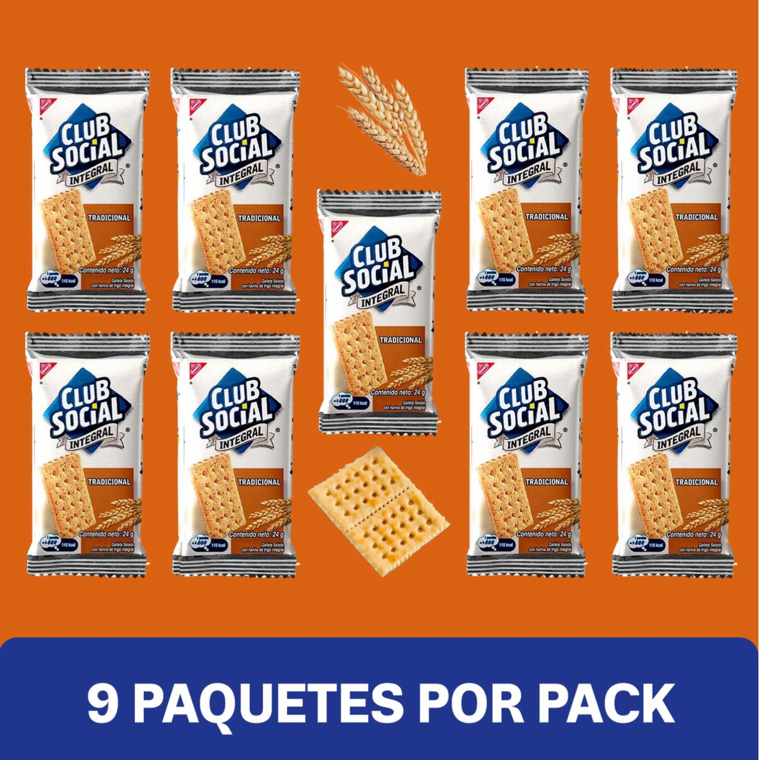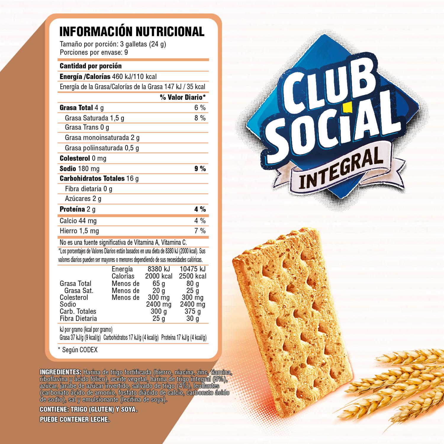 - Galletas Saladas Club Social Integral 6pack x 24g c/u con harina de trigo Integral, forma rectangular divida en tres partes. Disfruta en cada mordida de su crocancia y sabor único, con una porción es perfecta para disfrutar en el desayuno, trabajo o cuando quieras algo delicioso. También es una gran opción para picoteos y reuniones con familiares o amigos. Toma el paquete, ábrelo, parte la galleta, escucha el crack crocante y siente su delicioso sabor