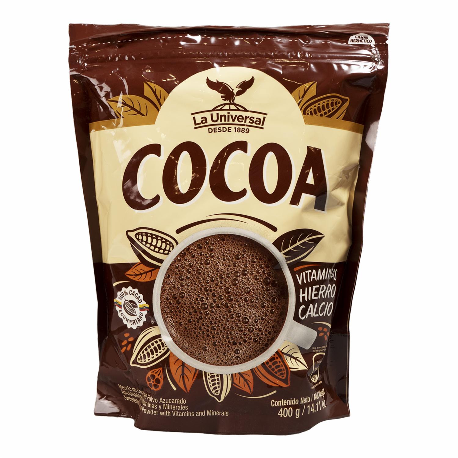 Disfruta del sabor intenso y reconfortante de la cocoa LA UNIVERSAL, enriquecida con vitaminas para cuidar tu salud mientras te das un gusto delicioso. Ideal para preparar bebidas calientes o frías, esta cocoa en polvo aporta ese toque dulce y chocolatoso que encanta a grandes y chicos. Su presentación de 400 g es perfecta para compartir momentos de calidez y energía en familia