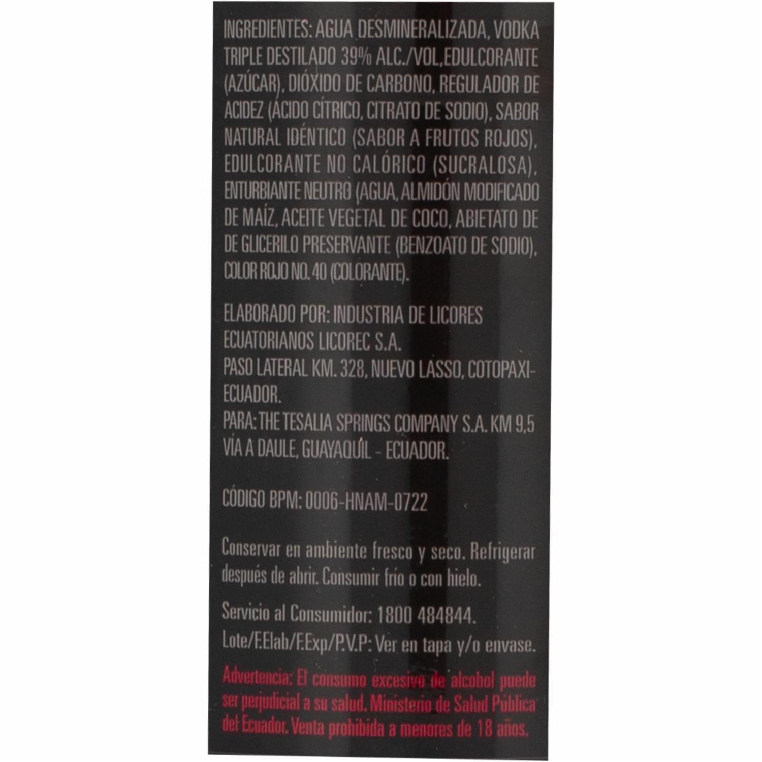 - Esta deliciosa mezcla de vodka con el sabor vibrante y afrutado de los frutos rojos es perfecta para compartir en reuniones, fiestas o disfrutar en una tarde relajada. Su sabor suave y refrescante hará que cada sorbo sea una verdadera delicia, ideal para quienes buscan un toque especial en sus bebidas