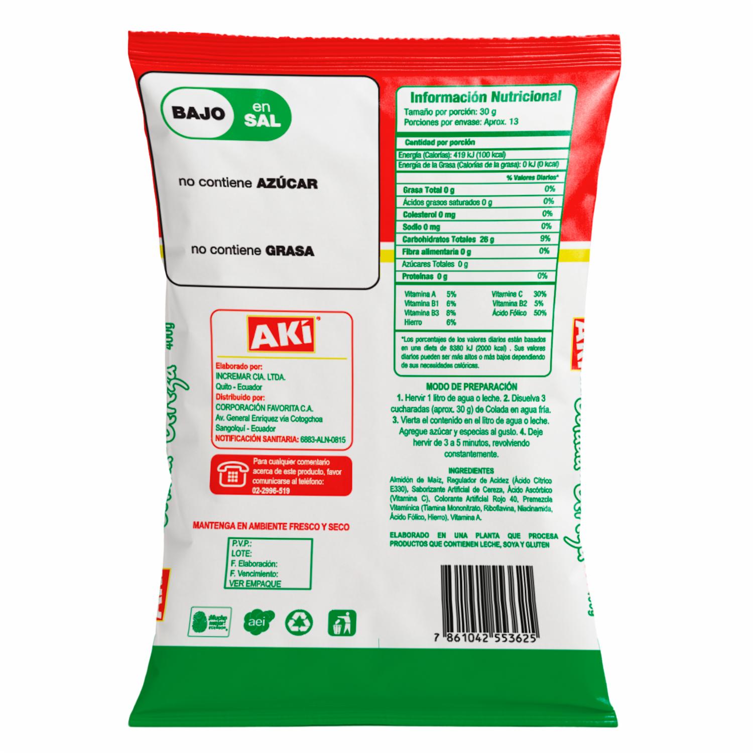 consultando preciosColada Sabor Cereza AKÍ 400 G – AKÍ. Disponible en nuestros locales. Precio y stock pueden variar según la tienda.