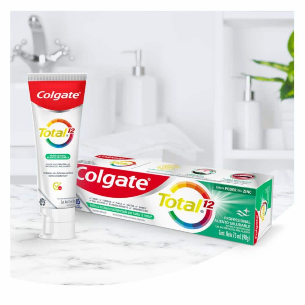 • La crema dental Colgate Total 12 Salud Visible con defensa antibacterial reforzada por hasta 12 horas* es ideal para lograr una protección eficaz contra las bacterias que causan el mal aliento. Esta Crema de dientes te proporciona una limpieza bucal eficaz y profunda gracias a su tecnología superior** que apoya las defensas naturales de la boca y mantiene tus dientes más sanos