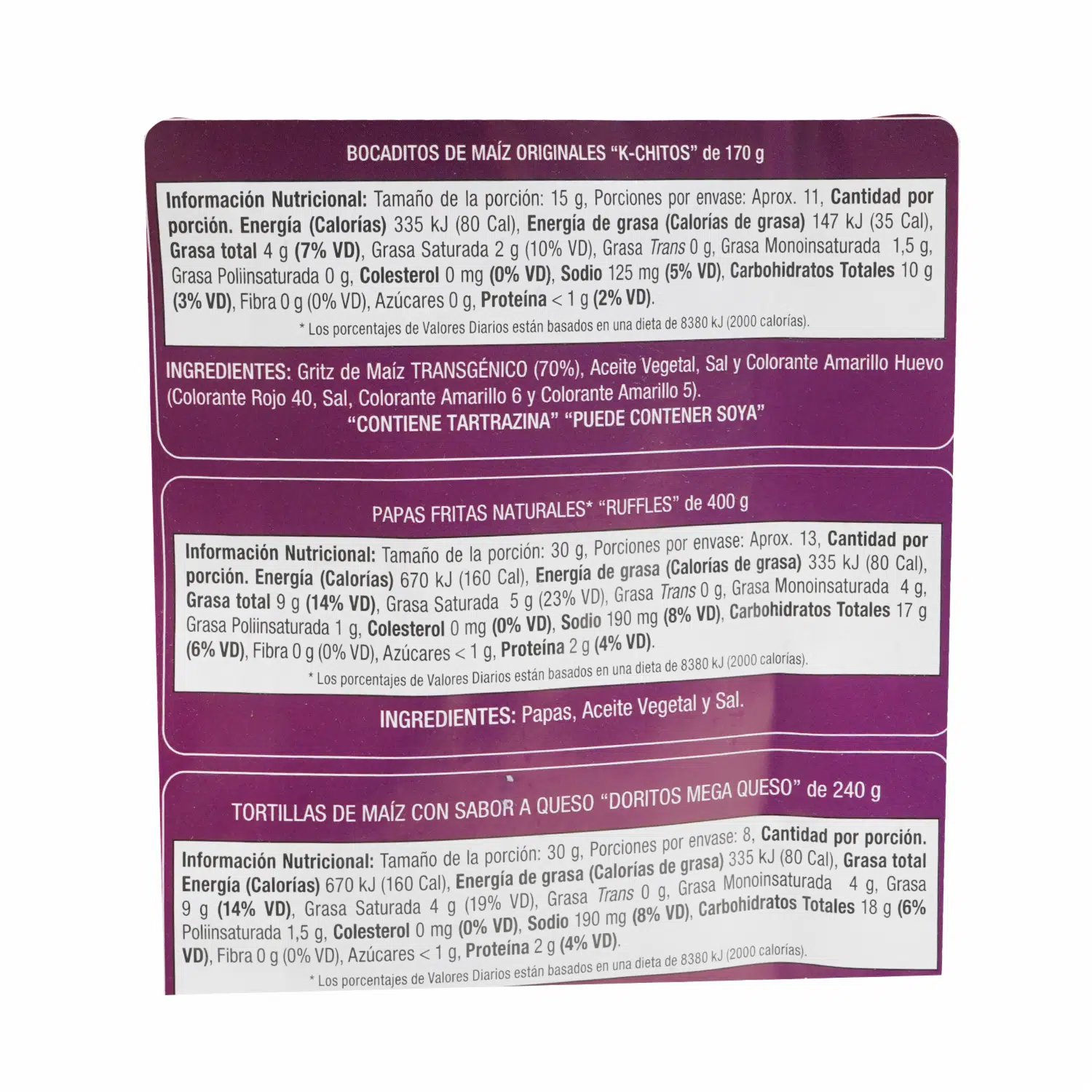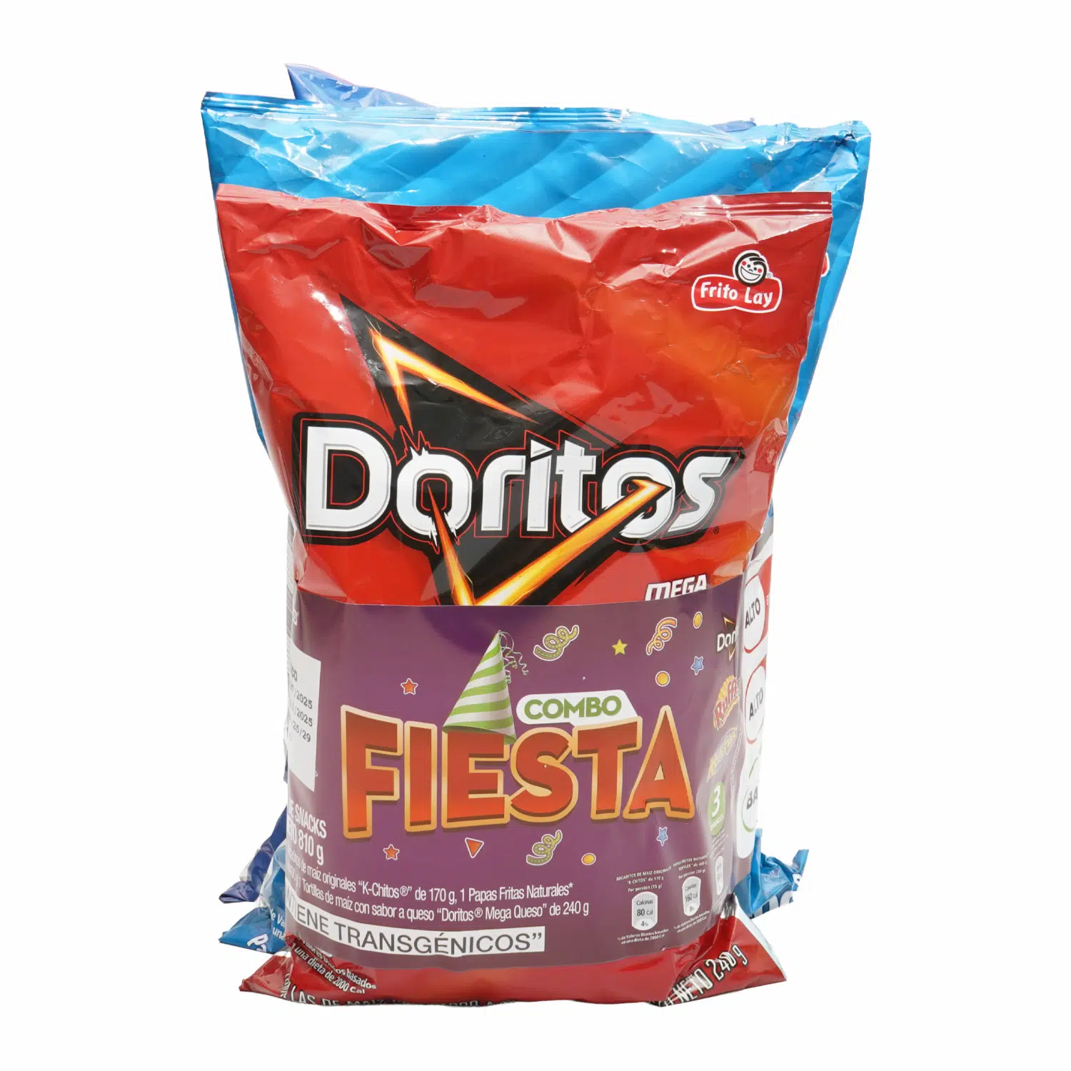 - ¡La fiesta está servida! Este combo trae lo mejor de tres mundos: Doritos, Ruffles y Kchitos, todos con sabores irresistibles y texturas crujientes. Ideal para reuniones, picnics o para disfrutar solo cuando quieras algo delicioso y variado. ¡Diversión y sabor en cada bocado!