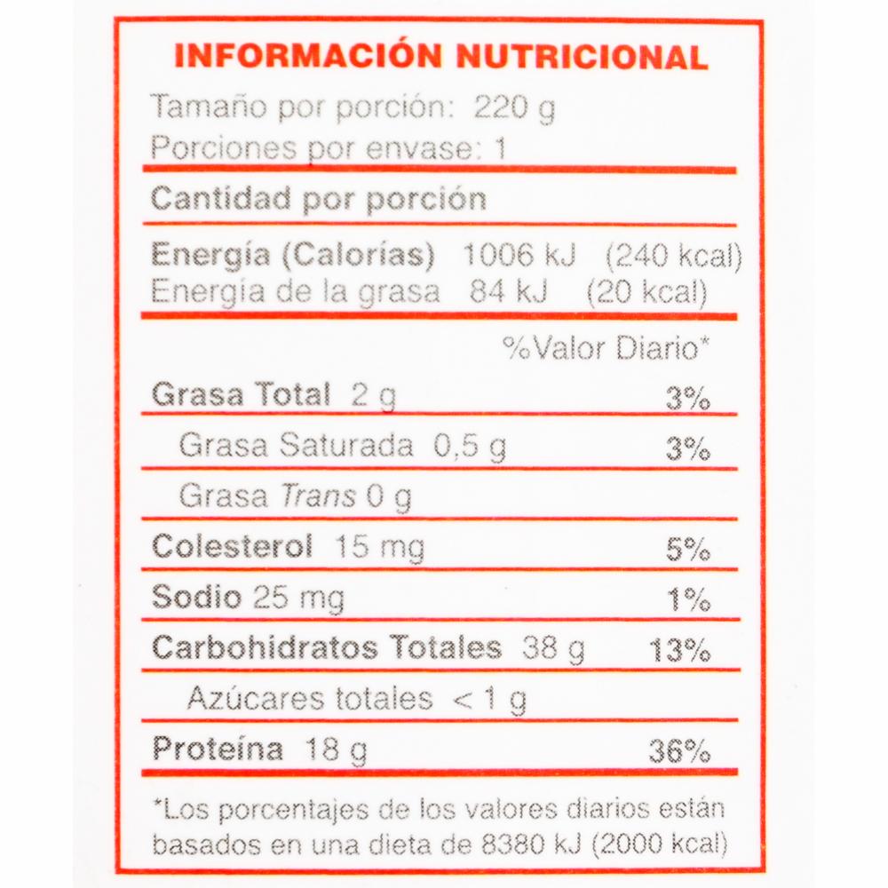 - Contiene carne, quinua y vegetales. - Es una fuente de proteínas y fibra. - No contiene conservantes ni colorantes artificiales. - Puede ser consumido frío o caliente. - Es un producto listo para consumir, no requiere preparación adicional