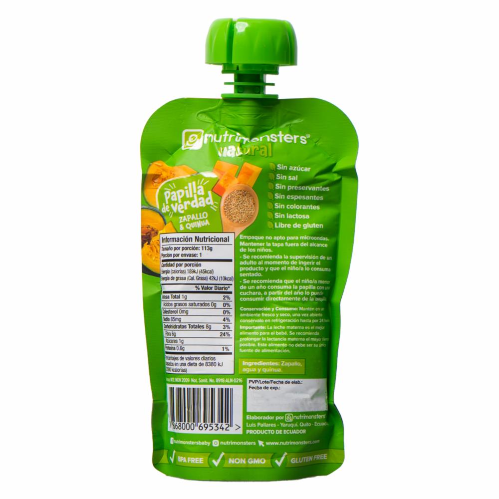 Compota Pouch Zapallo Y Quinoa NUTRIMONSTERS 113 G – NUTRIMONSTERS. Disponible en nuestros locales. Precio y stock pueden variar según la tienda.