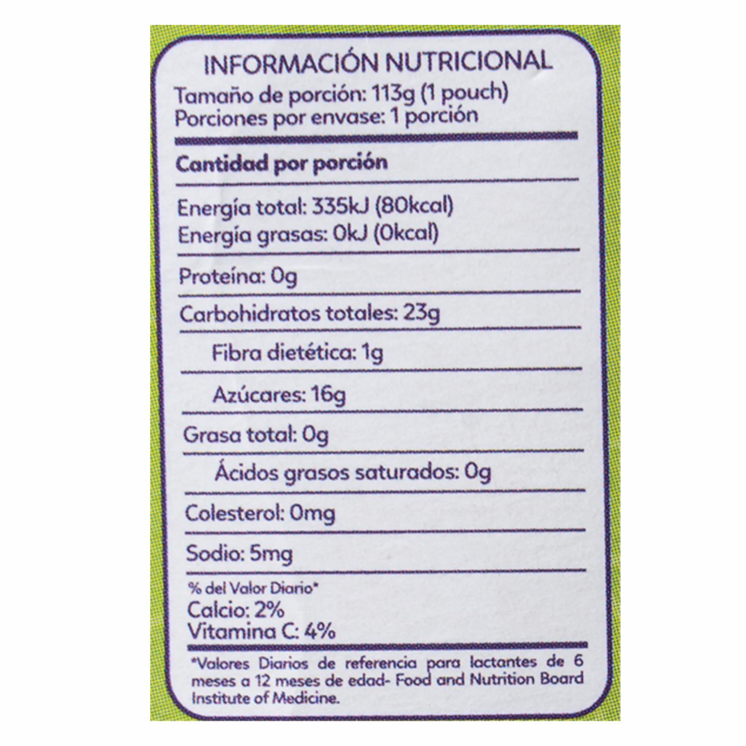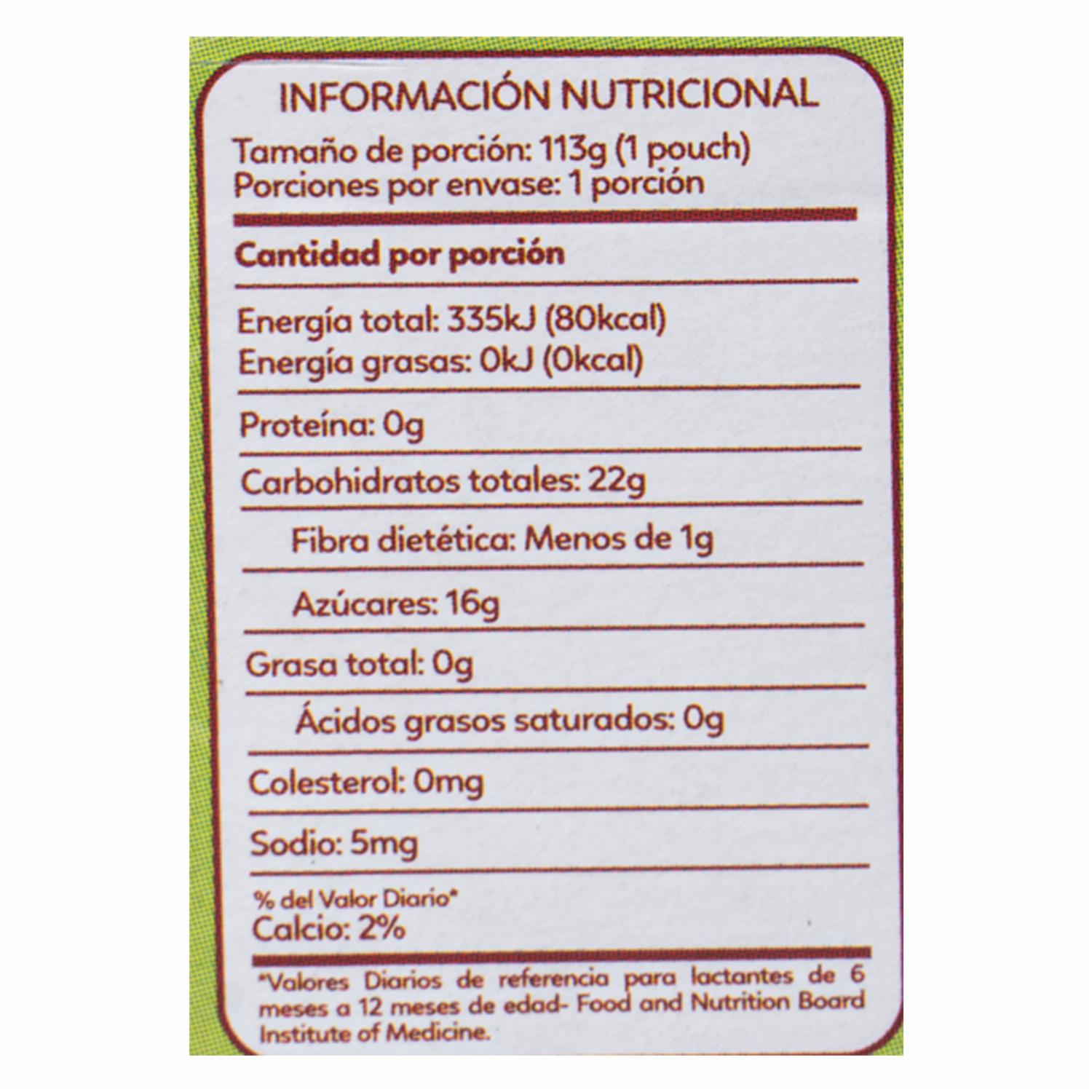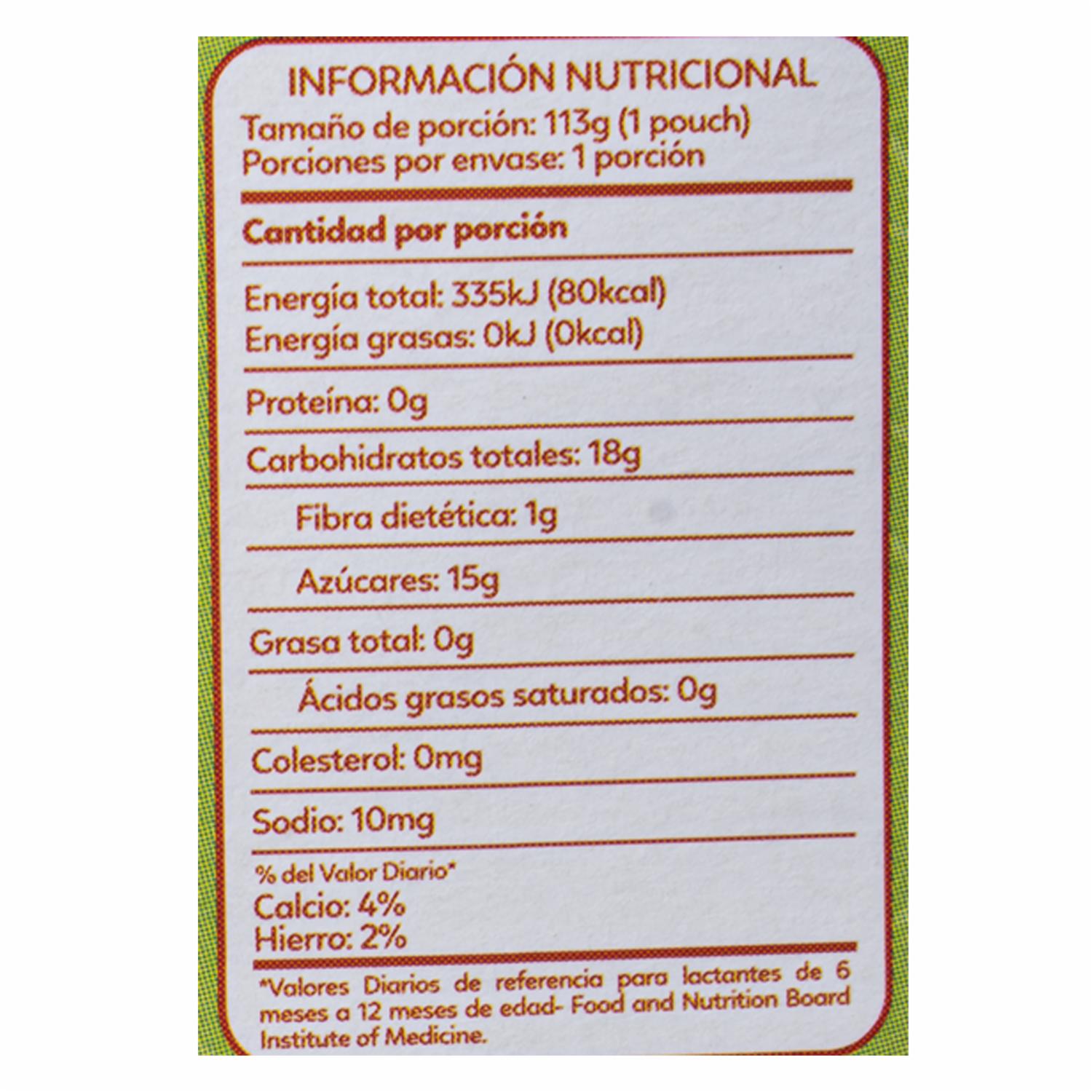 - - Compota de frutas envasada en pack de 4 unidades. - Sabores surtidos. - Ideal para bebés y niños pequeños. - Sin conservantes ni colorantes artificiales. - Textura suave y fácil de digerir. - Rico en vitaminas y minerales esenciales para el crecimiento y desarrollo del bebé