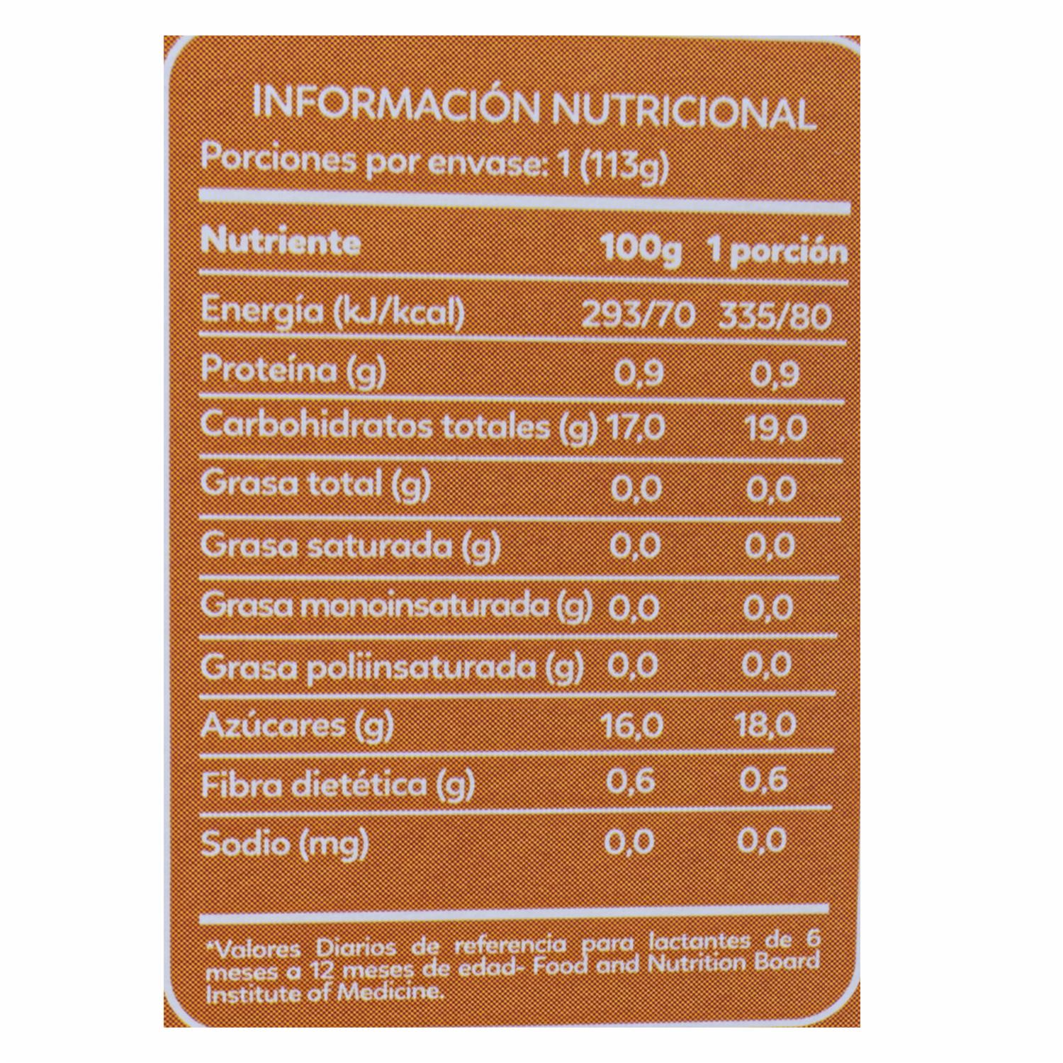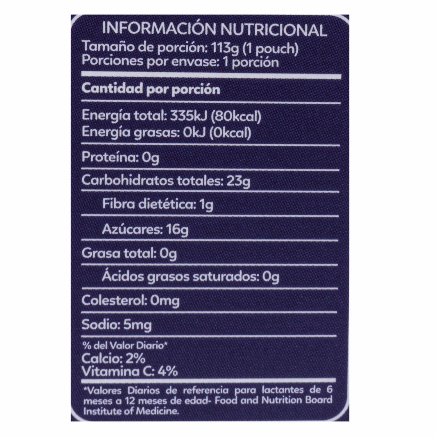 - Compotas Mix + Durazno y Manzana viene en un paquete de 2 unidades. - Es un alimento para bebés a partir de los 6 meses de edad. - Está elaborado con frutas naturales, sin conservantes ni colorantes artificiales. - Es una fuente de vitaminas y minerales esenciales para el crecimiento y desarrollo del bebé. - Tiene una textura suave y cremosa, fácil de digerir para el bebé. - Viene en un práctico envase con tapa de rosca, ideal para llevar en el bolso o en la mochila del bebé