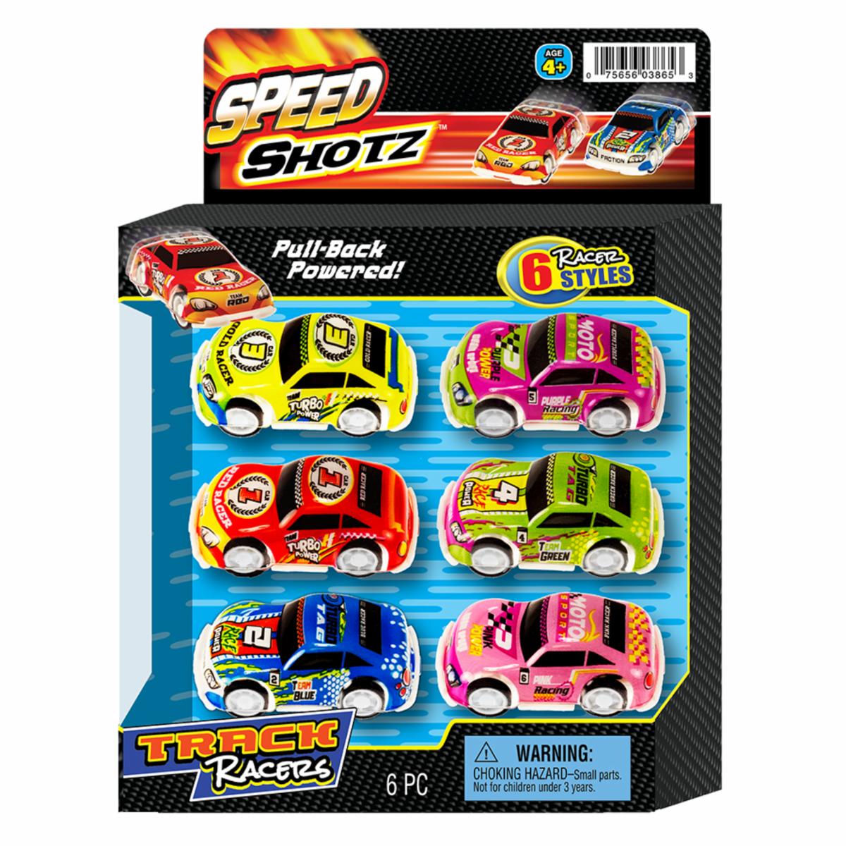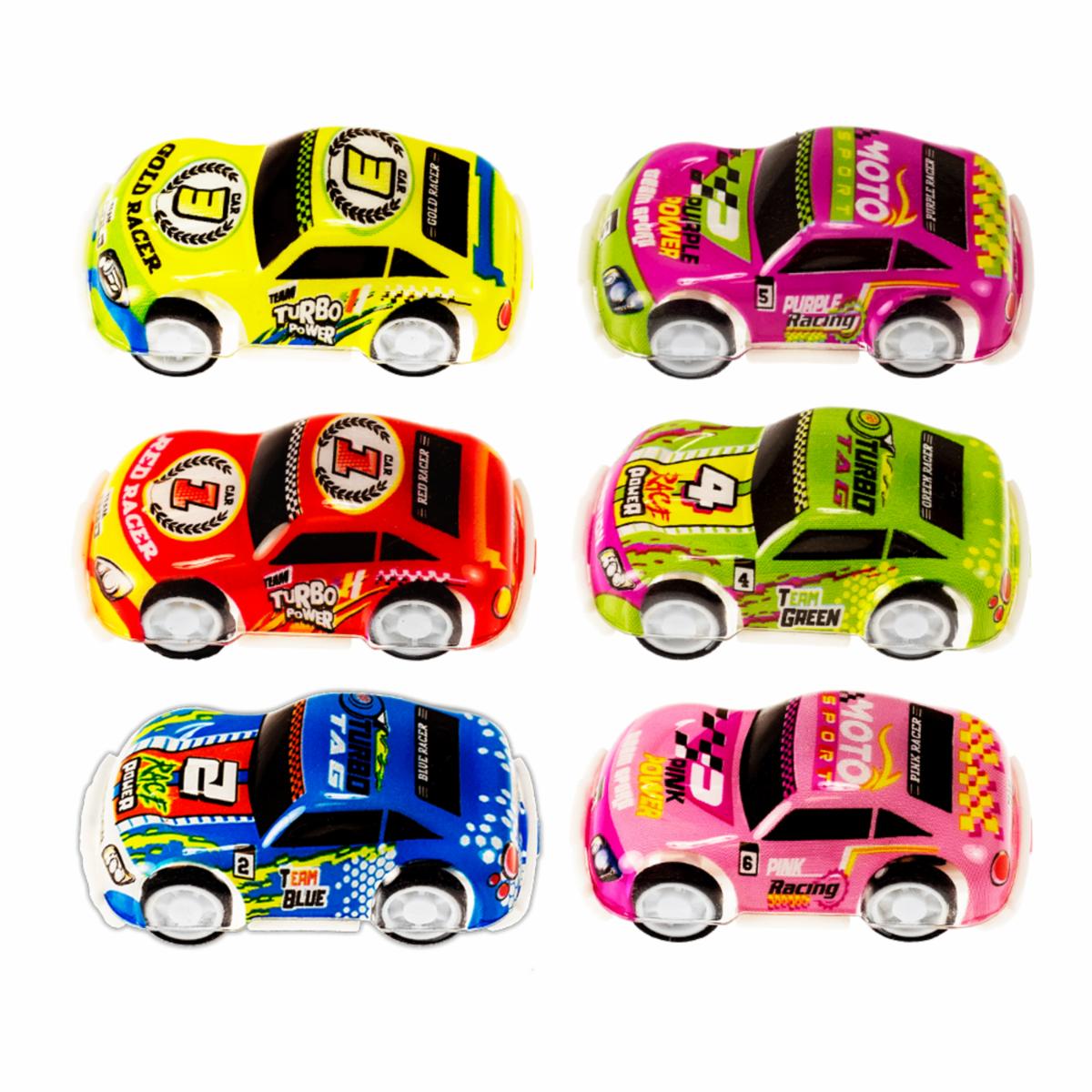 - Estos 6 coches de carreras vienen en un paquete. Son rápidos y cuentan con tracción trasera. Simplemente tira hacia atrás y deja que el auto ruede