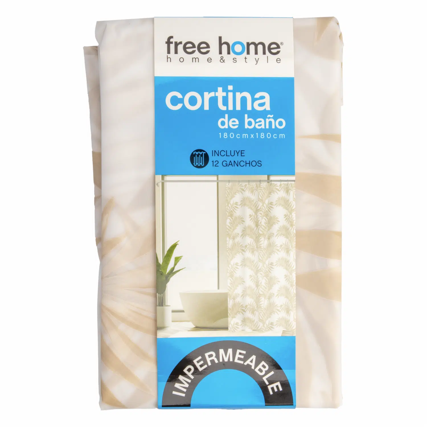 Cortina de baño FREE HOME, ideal para mantener tu baño seco y darle un toque fresco y natural. Características - Material resistente y duradero - Medidas 180x180 cm - Incluye aros para fácil instalación - Protege el área de la ducha del agua Incluye - Cortina de baño, 1 pieza - Aros de instalación, 1 set