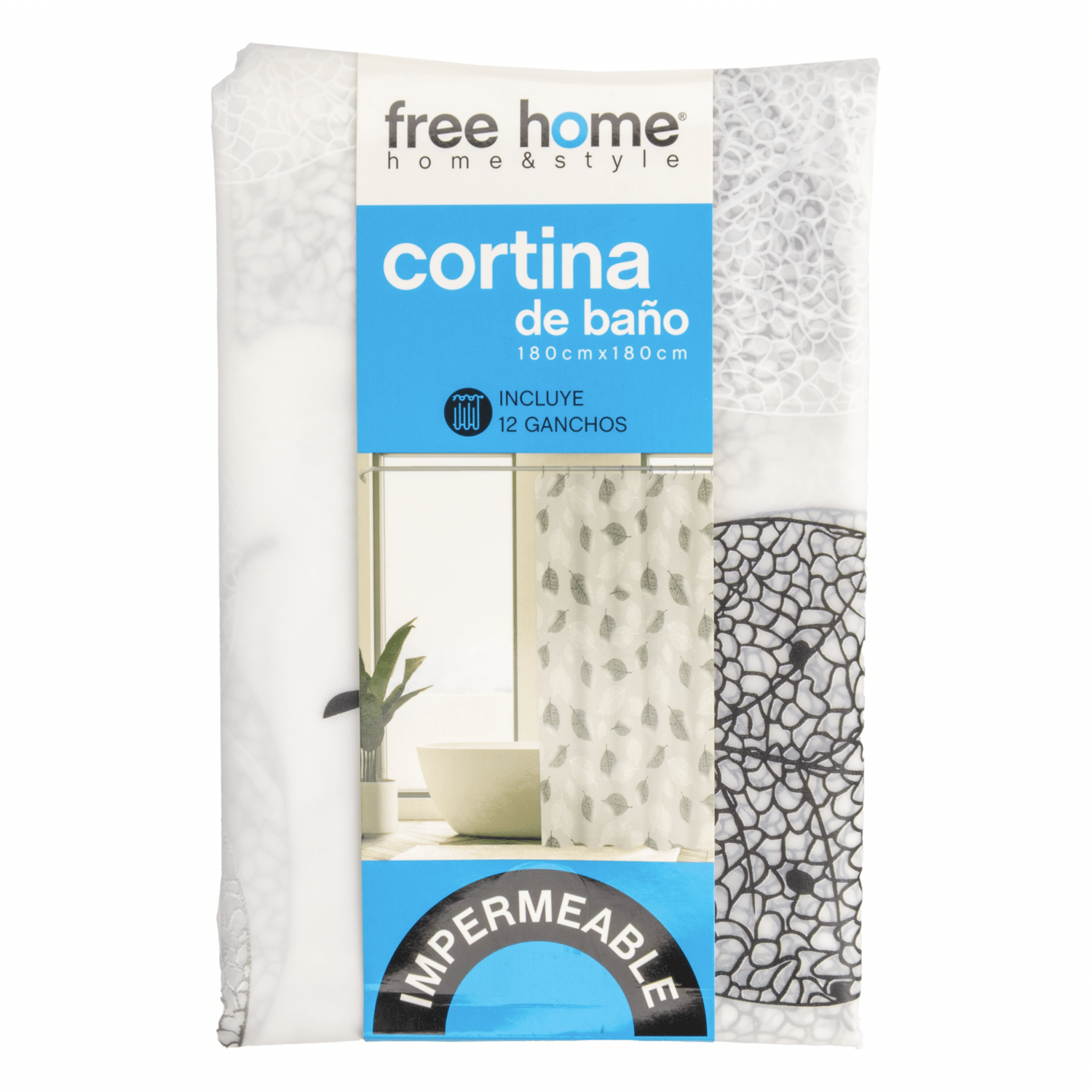 Cortina de baño FREE HOME, ideal para mantener tu baño seco y darle un toque fresco y natural. Características - Material resistente y duradero - Medidas 180x180 cm - Incluye aros para fácil instalación - Protege el área de la ducha del agua Incluye - Cortina de baño, 1 pieza - Aros de instalación, 1 set