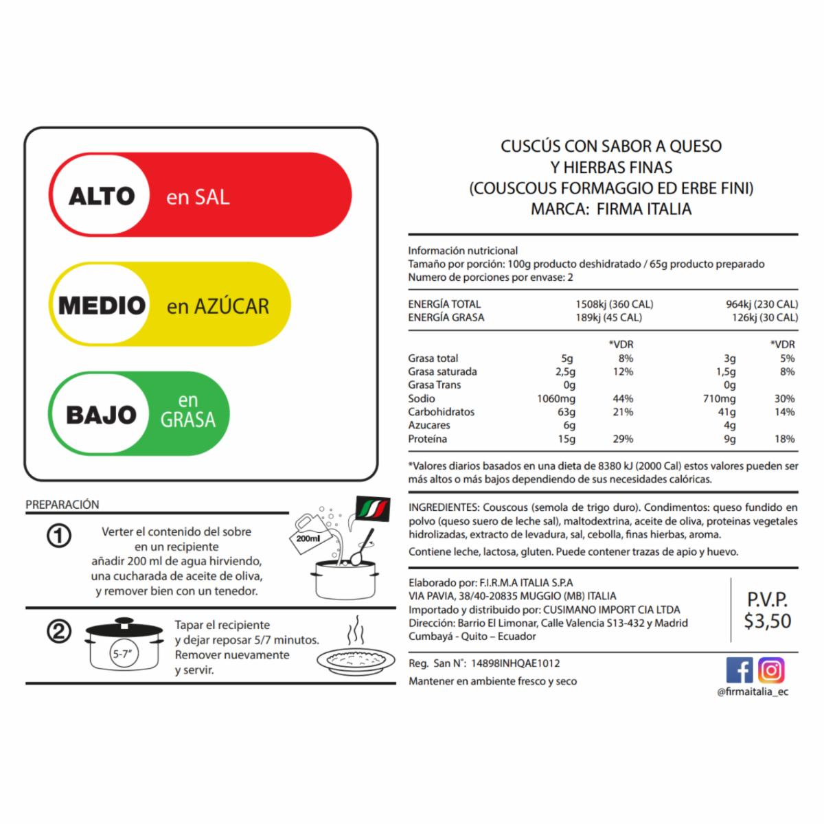 consultando preciosCouscous Formaggio Sabor A Queso Y Finas Hierbas FIRMA ITALIA 130 G – FIRMA ITALIA. Disponible en nuestros locales. Precio y stock pueden variar según la tienda.