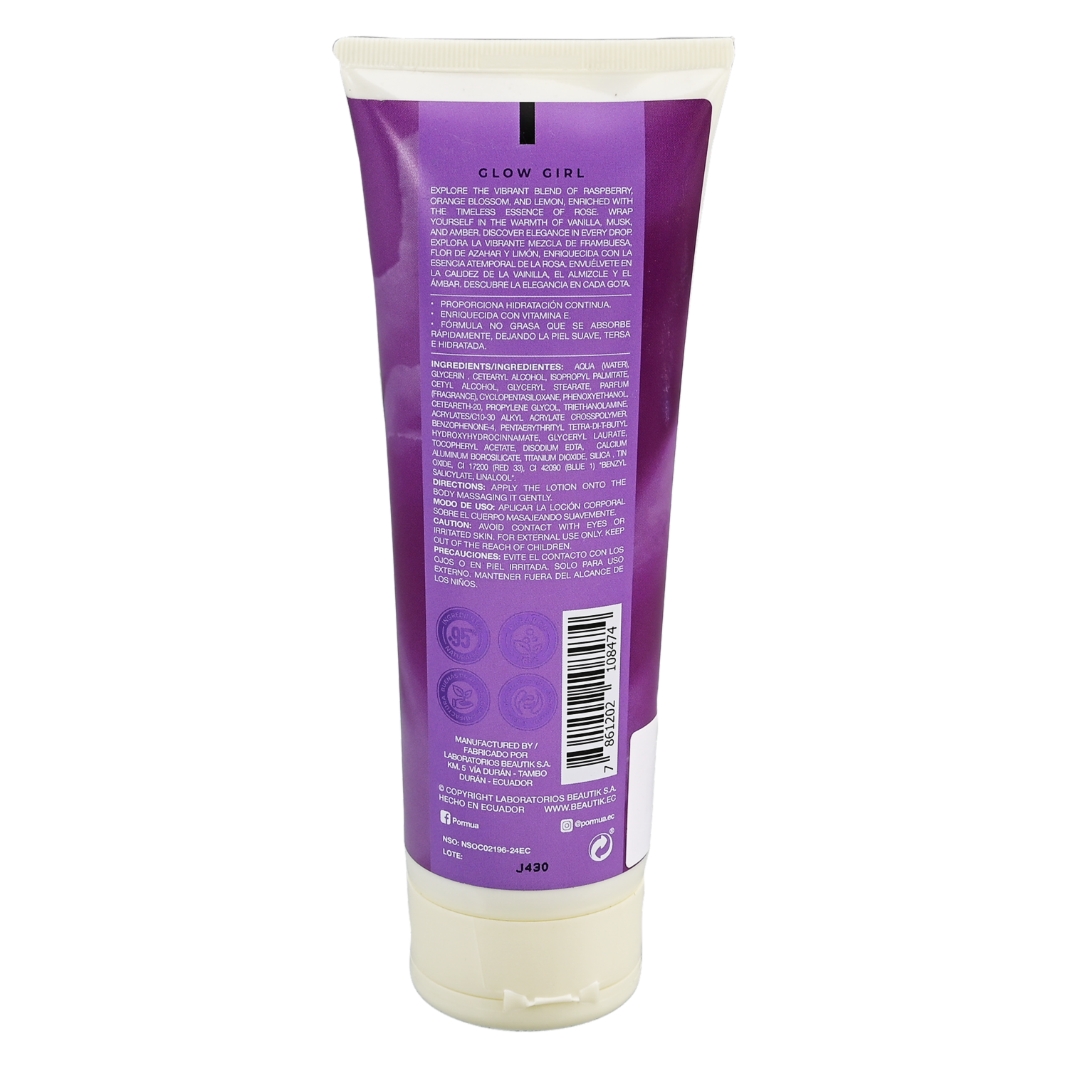 - Crema corporal con brillos Glow Girl vitamina E hidrata y nutre la piel dejándola suave y luminosa. Su fórmula ligera se absorbe rápido y aporta un brillo sutil para realzar tu piel. Ideal para el cuidado diario que protege y embellece.