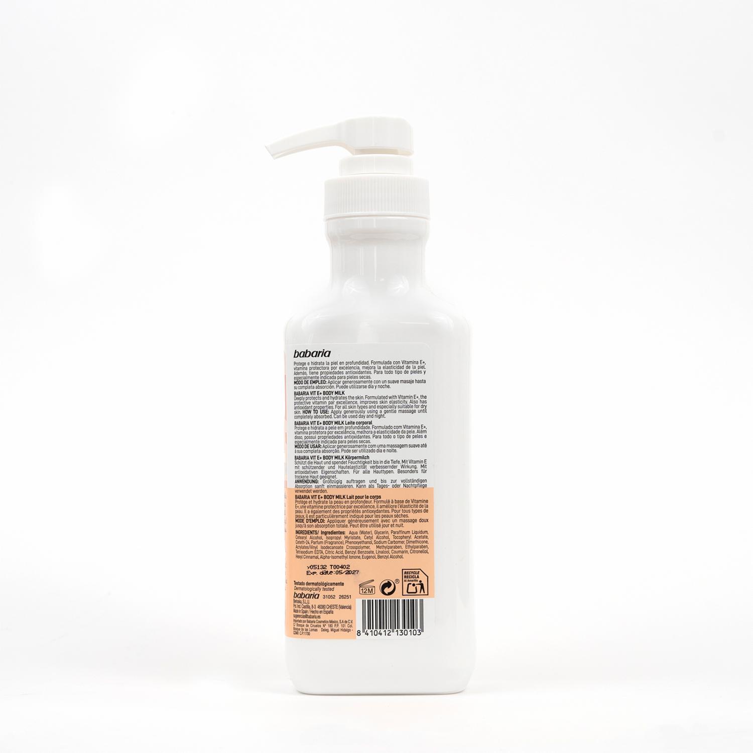 - La Leche corporal Vitamina E+ protege e hidrata la piel en profundidad. Formulada con Vitamina E, vitamina protectora por excelencia, mejora la elasticidad de la piel. Además, tiene propiedades antioxidantes. Para todo tipo de pieles y especialmente indicada para pieles secas