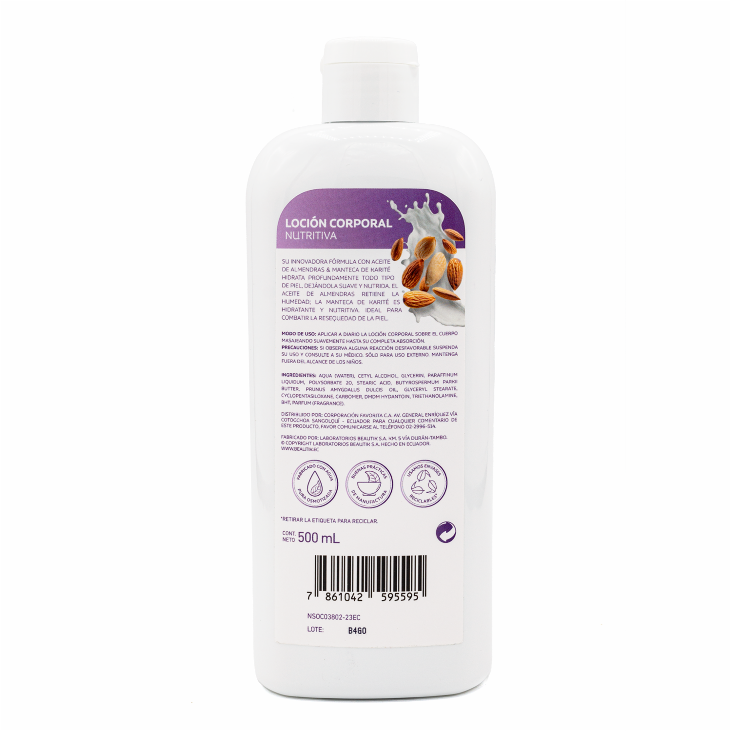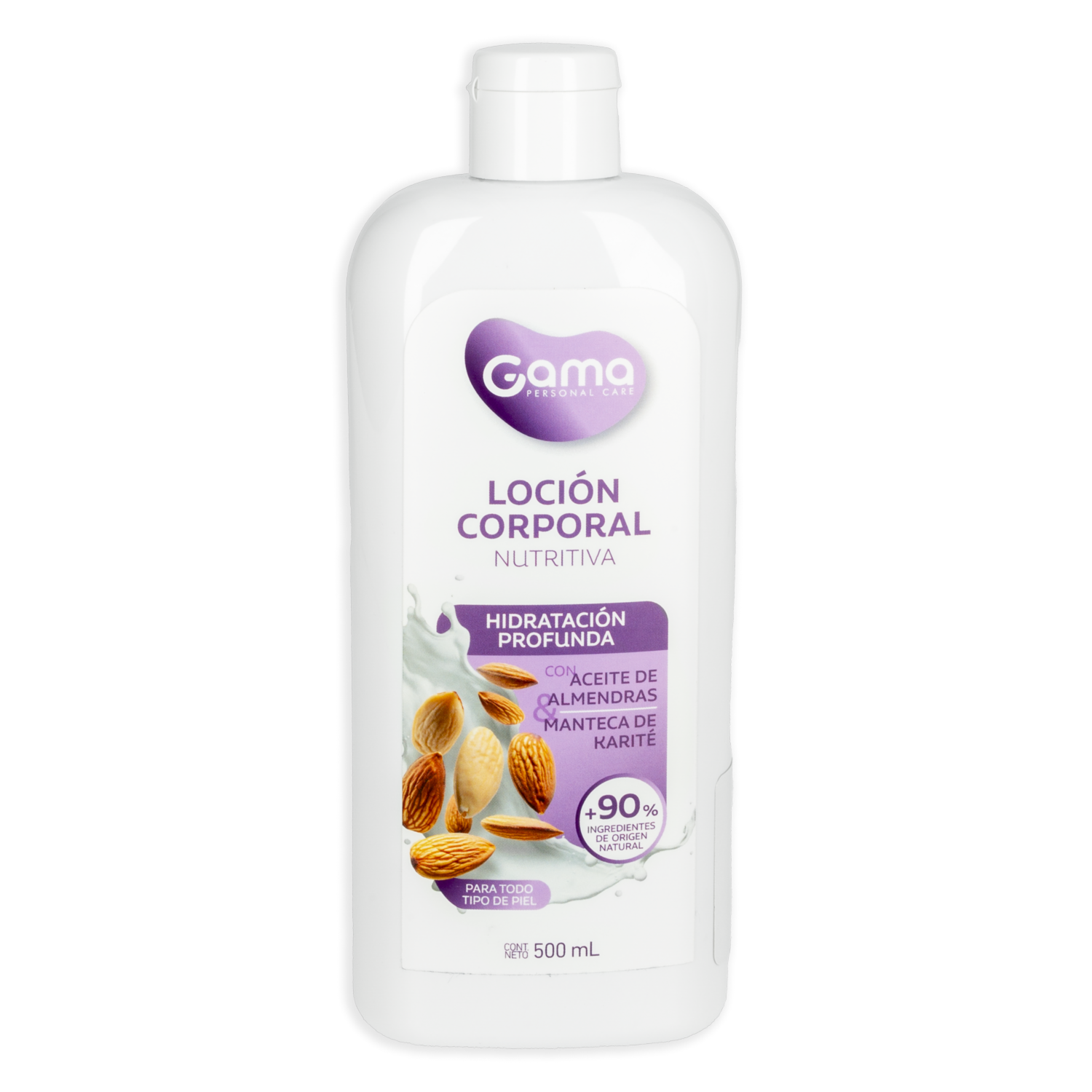 "GAMA Loción Corporal Nutritiva Hidratación Profunda: Con aceite de almendras y manteca de karité hidrata profundamente todo tipo de piel, dejándola suave y nutridaEl aceite de almendras retiene la humedad y la manteca de karité es hidrante y nutritiva, ideal para combatir la resequedad de la piel,+90% de ingredientes de origen naturalContenido: 500 ml"