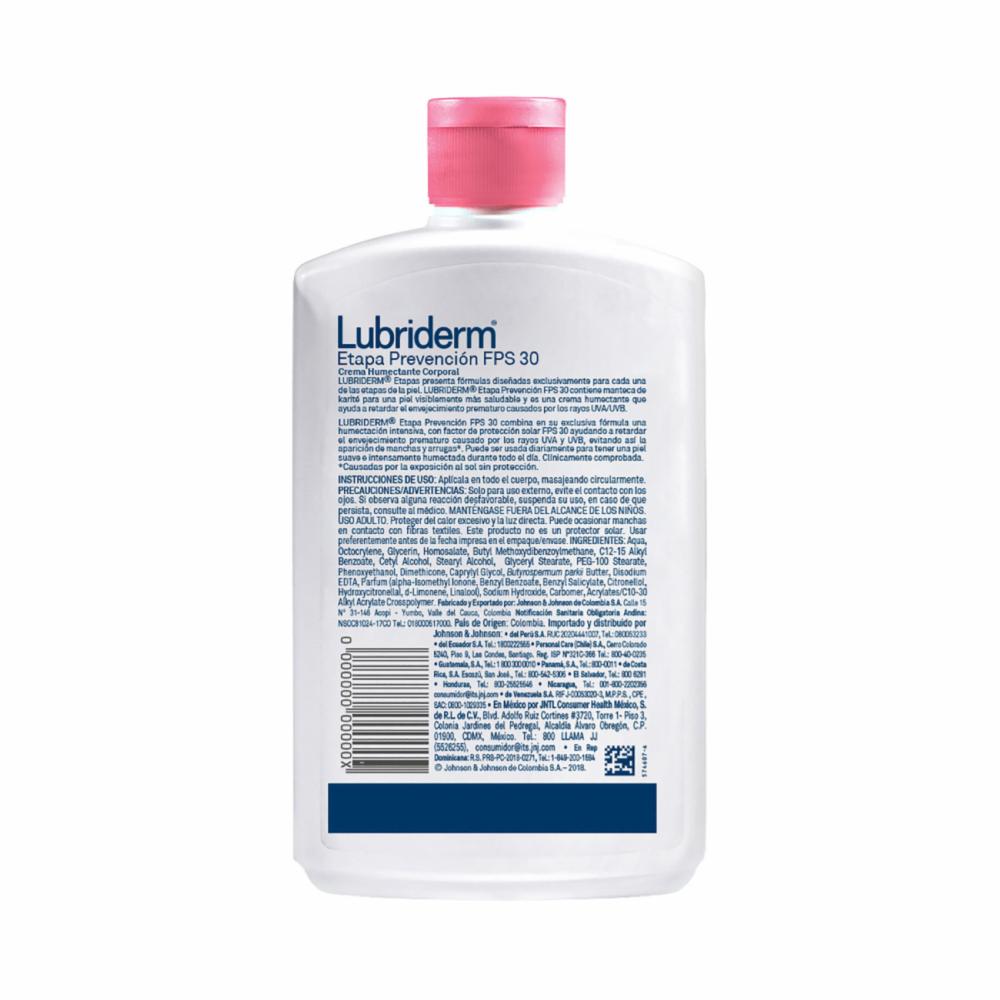 • LUBRIDERM Etapa Prevención FPS 30 contiene manteca de karité para una piel visiblemente más saludable y es una crema humectante que ayuda a retardar el envejecimiento prematuro causados por los rayos UVA/VB