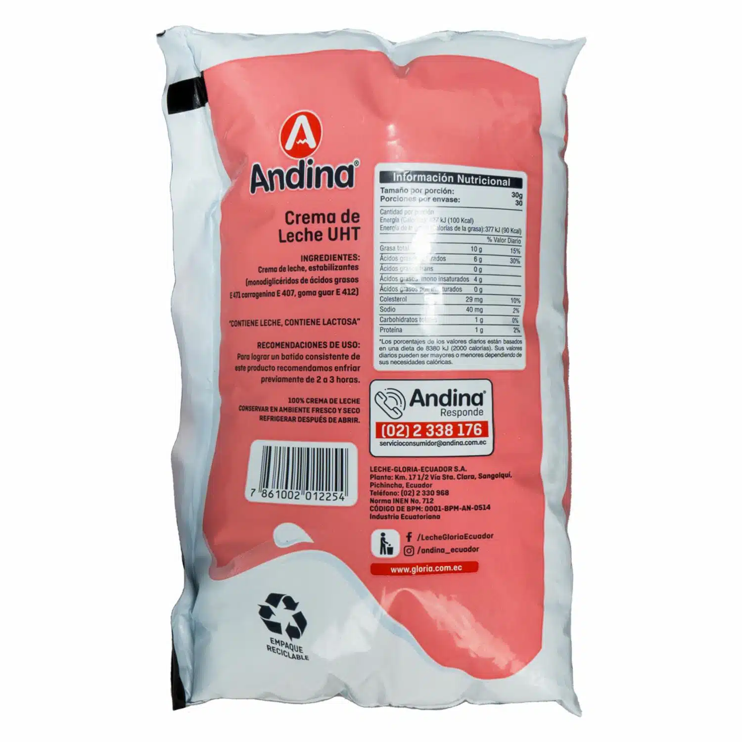 Crema De Leche Funda Uht ANDINA 900 Ml