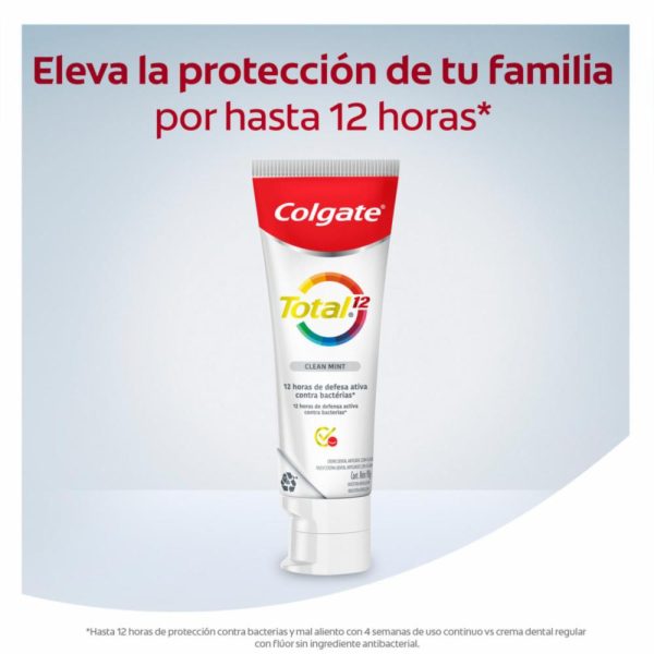 • Con la crema de dientes Colgate Total 12 tendrás una salud bucal completa para una sonrisa sana mientras disfrutas de una boca limpiaHasta 12 horas de protección contra las bacterias y el mal aliento con el uso continuo por 4 semanas