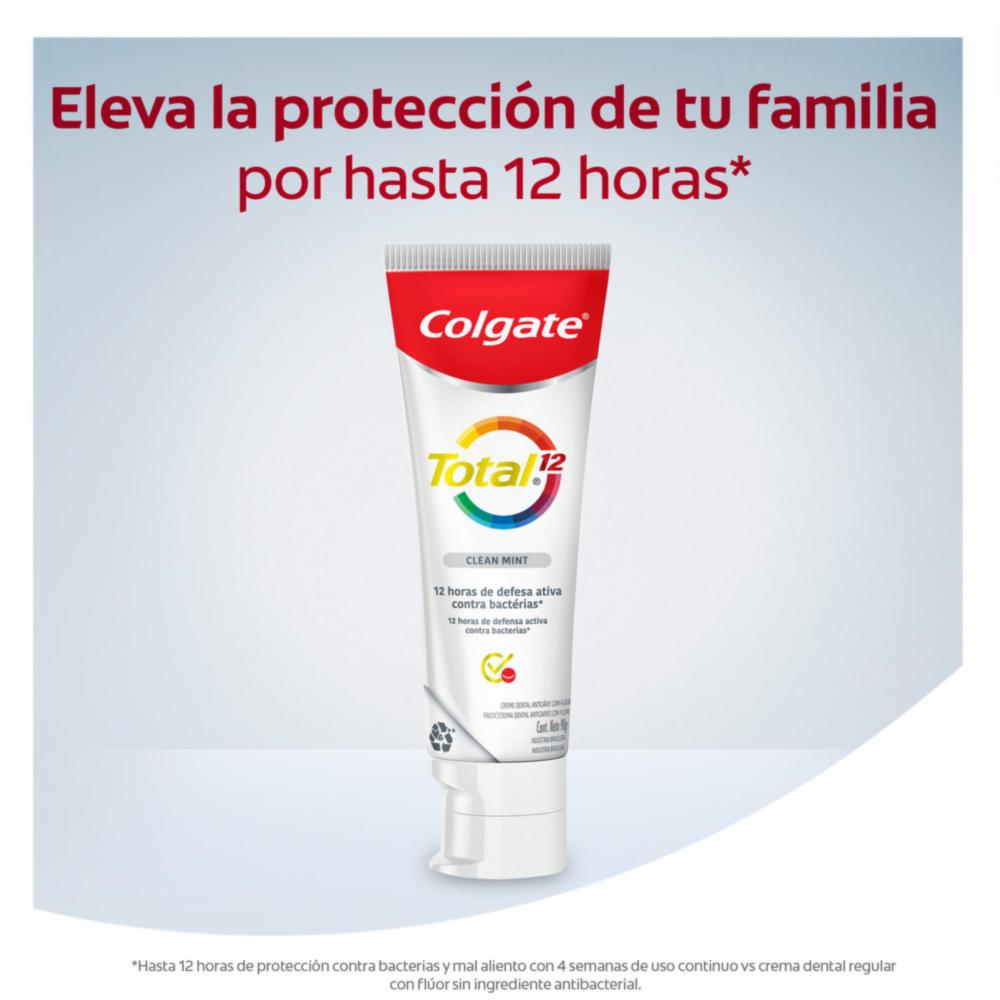 • La crema dental Colgate Total 12 Clean Mint es ideal para el aseo bucal y mantener una boca sana, su tecnología superior reduce bacterias en dientes, lengua, mejillas y encías además de apoyar las defensas naturales de tu bocaColgate Total 12 Clean Mint con el poder del Zinc es perfecta para tener los dientes limpios, previene el mal aliento y brinda 12 horas de defensa activa contra bacterias