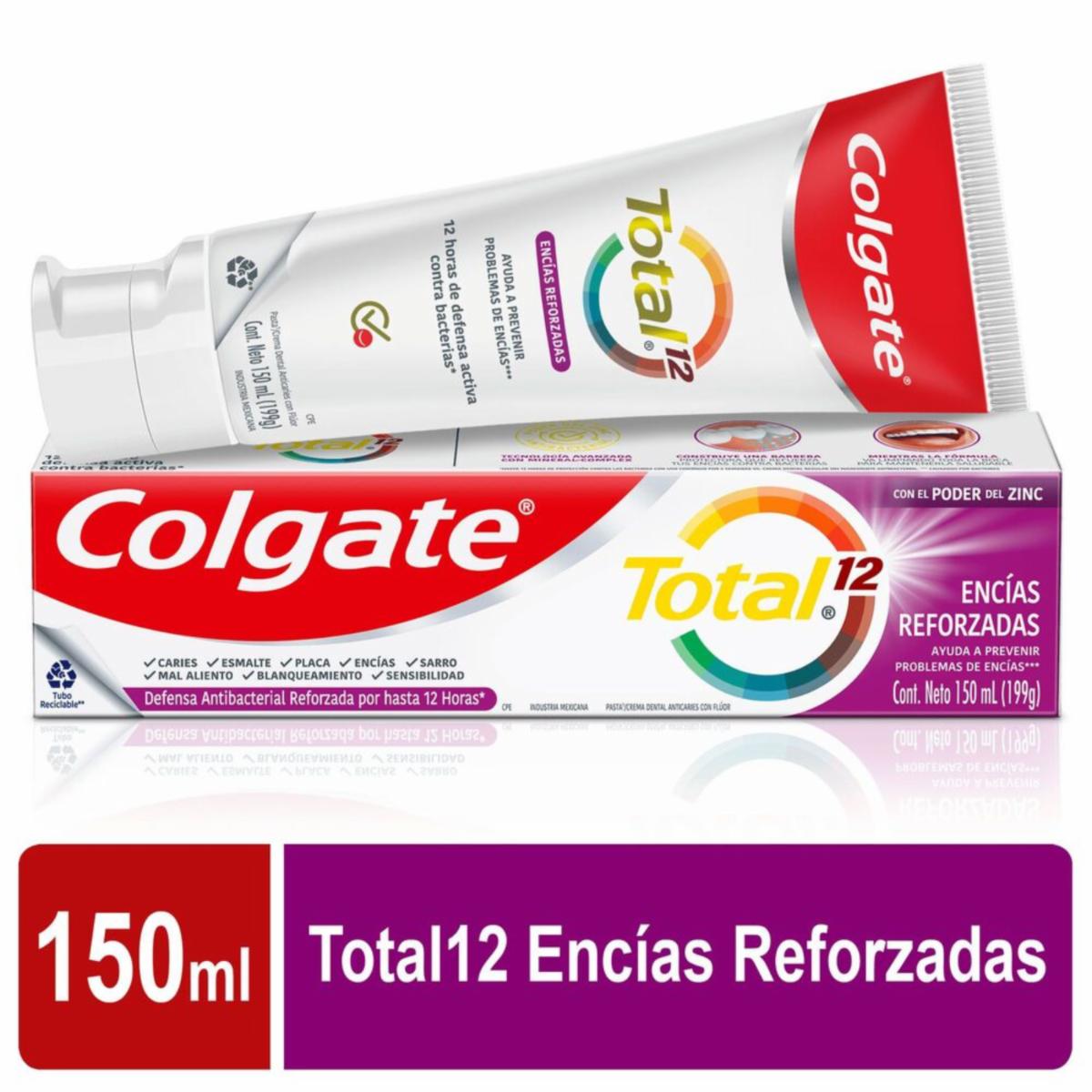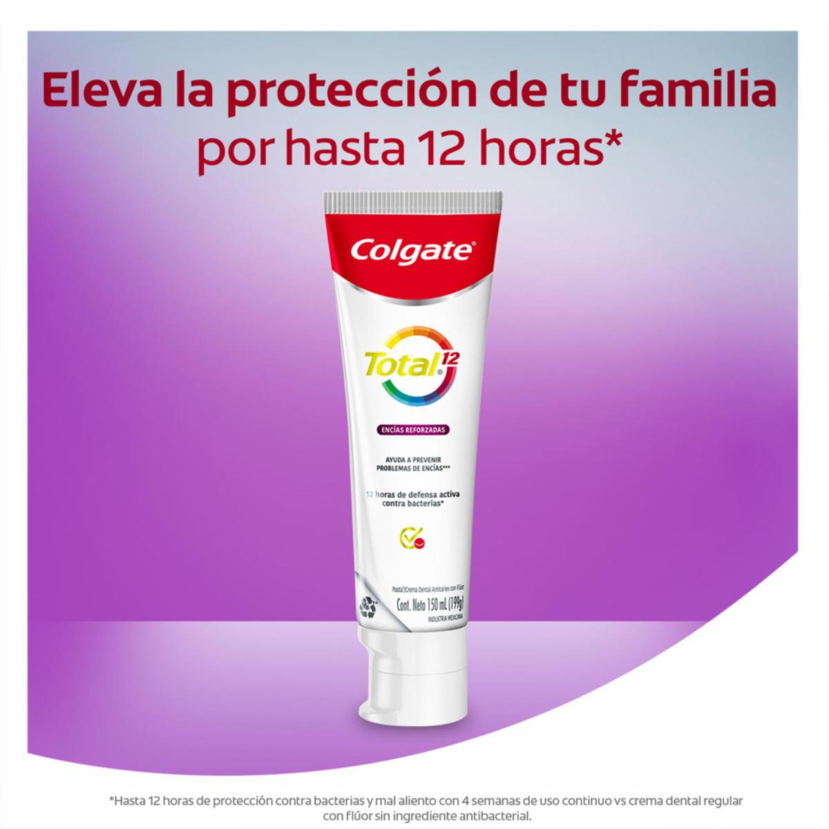 • La crema dental Colgate Total 12 Encías Reforzadas tiene tecnología avanzada con mineral-complex que brinda 12 horas de defensa activa contra bacterias y mantiene tu boca sana con un aliento fresco./ Su fórmula con el poder del Zinc apoya las defensas naturales de tu boca, evita la formación de placa bacteriana y ayuda a prevenir problemas de encías, creando una barrera protectora que refuerza tus encías contra bacterias
