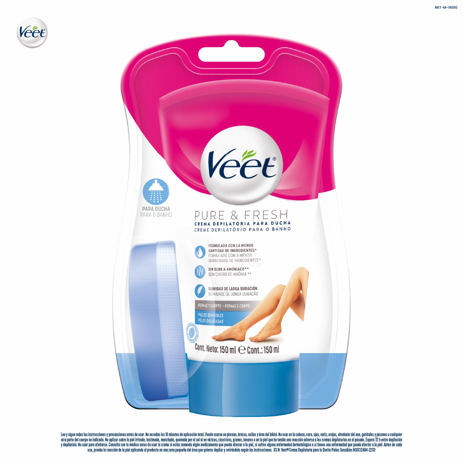 - Nueva Formulación De Veet Más Pure & Fresh. Crema Depilatoria Para Ducha - Pieles Sensibles 150 Ml. Contiene Menos De 35% De Ingredientes Químicos, Sin Olor A Amoníaco Y Suavidad De Larga Duración. Diseñado Para Usarlo En Piernas, Bikini, Brazos Y Axilas. Con Su Uso Regular, Podrás Disfrutar De Una Piel Suave Y Libre De Vello Por Más Tiempo Que Con El Afeitado Convencional. "más Duradero Que Las Rasuradoras O Cuchillas". "dermatológicamente Comprobado"