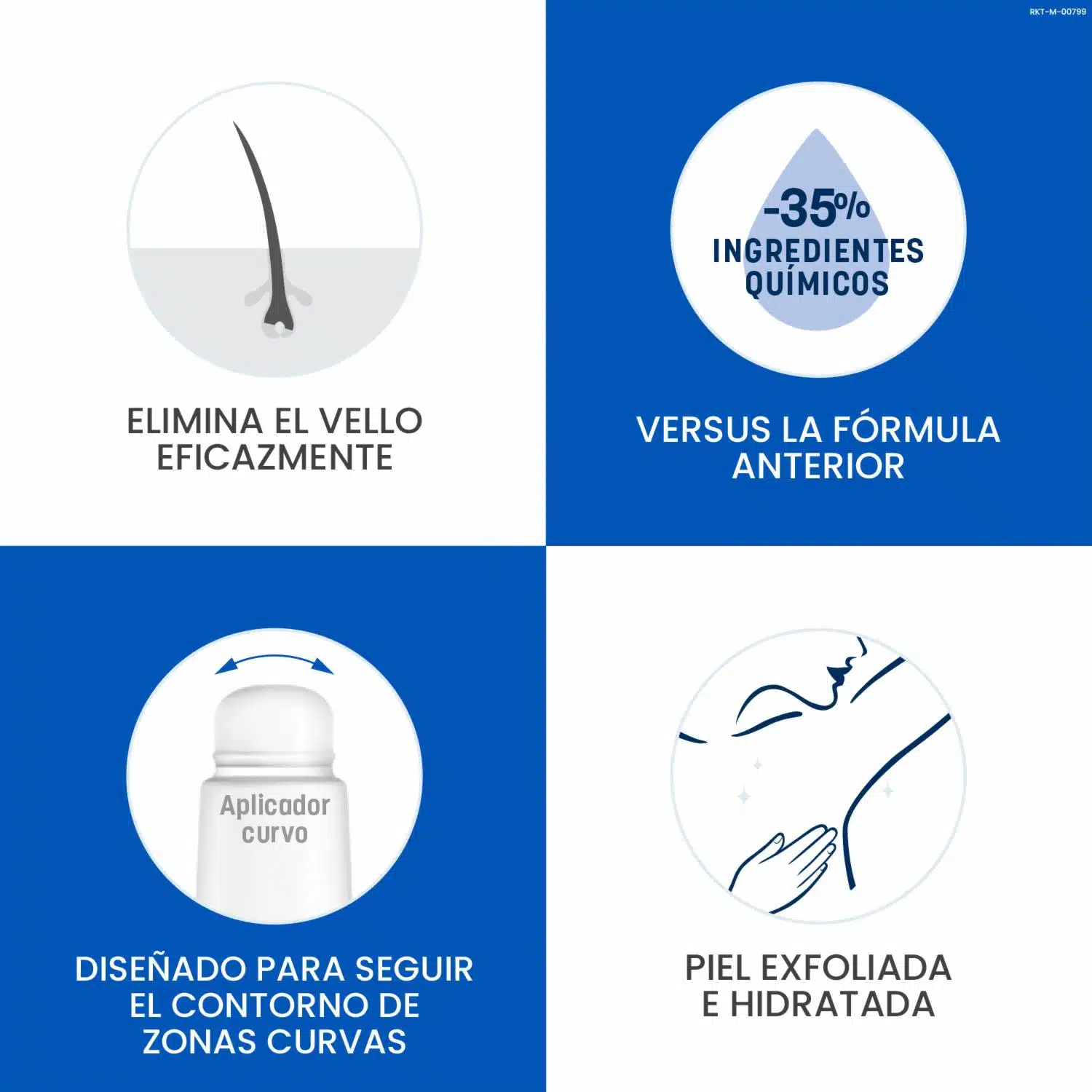 • Es un producto que ayuda a una depilación específicamente para la eliminación suave y eficaz del vello en las áreas sensibles del cuerpo