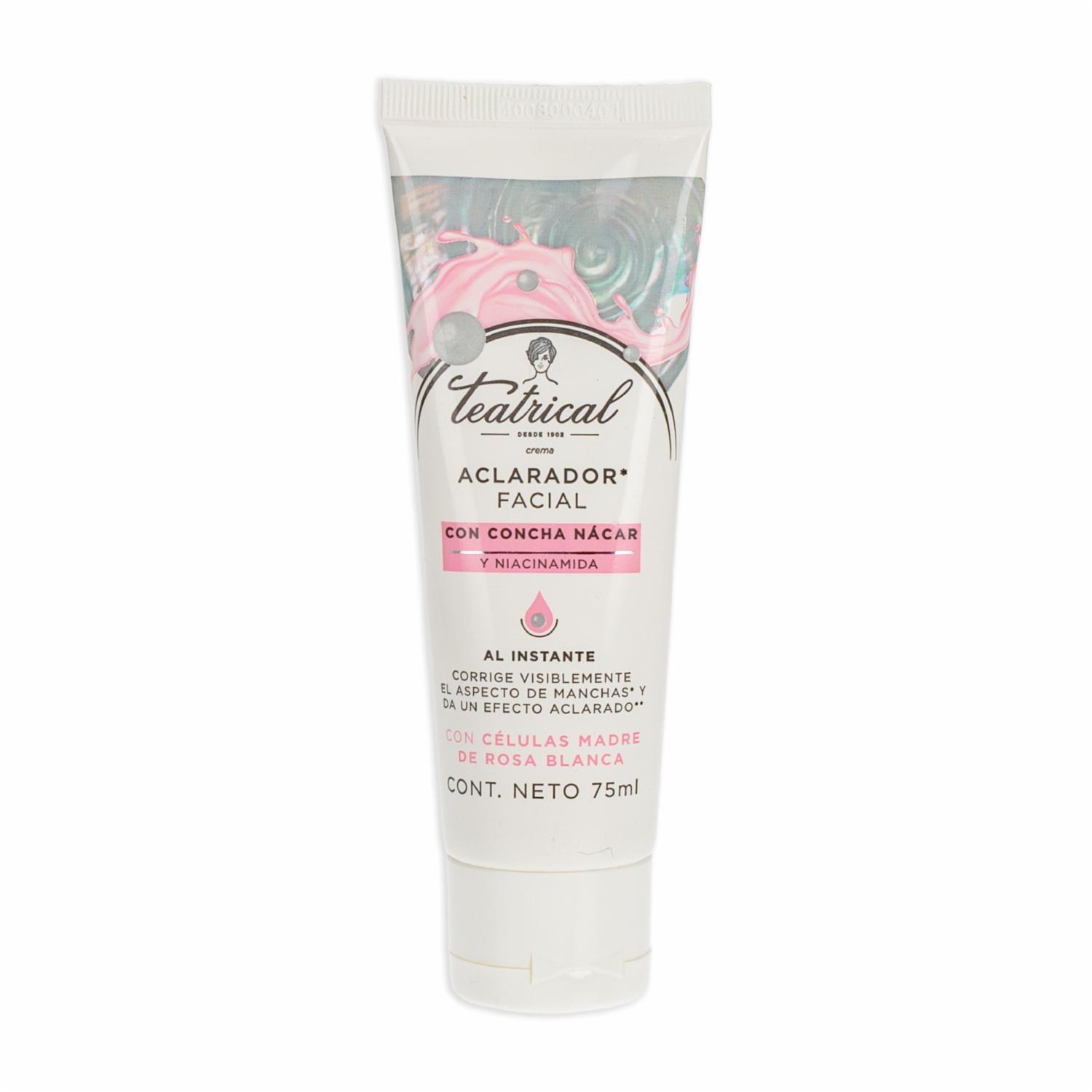 - La Crema Facial Aclaradora Teatrical es una fórmula especial con concha nácar, niacinamida y células madre de rosa blanca. Esta combinación única ayuda a corregir visiblemente el aspecto de las manchas y proporciona un efecto aclarador. Se observa una despigmentación a partir del sexto día de uso. Además, ofrece un efecto instantáneo gracias a la presencia de Dióxido de Titanio