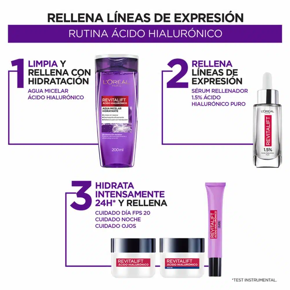 Crema Antiedad L'óreal Paris Revitalift Acido hialurónico -Día: Hidrata intensamente 24h, rellena y previene las líneas de expresión. FPS 20 que protege de los rayos UV solares. -Disminuye arrugas y aporta firmeza para una piel visiblemente más joven