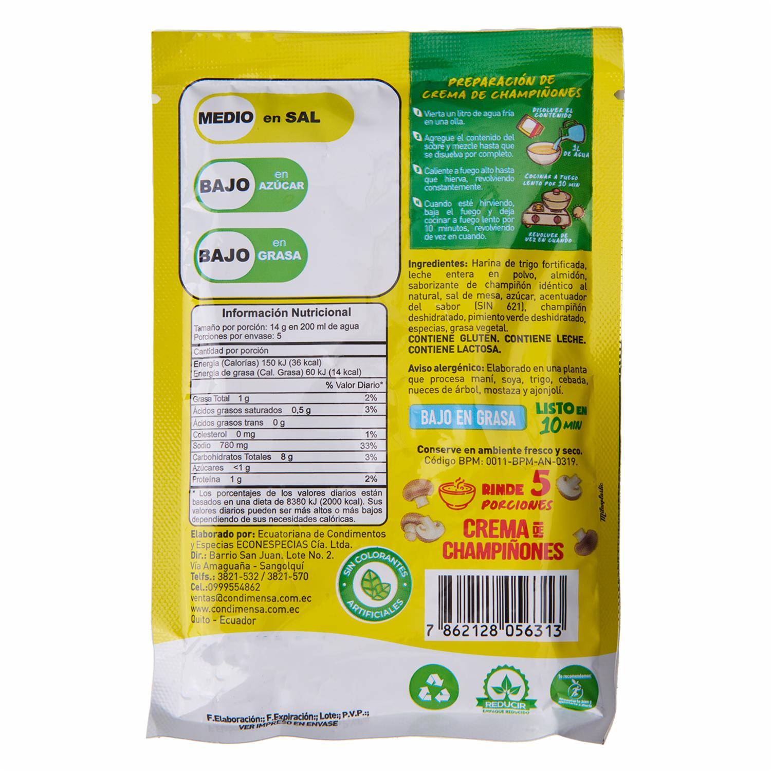 Crema Instantánea De Champiñones CONDIMENSA 70 G – CONDIMENSA. Disponible en nuestros locales. Precio y stock pueden variar según la tienda.