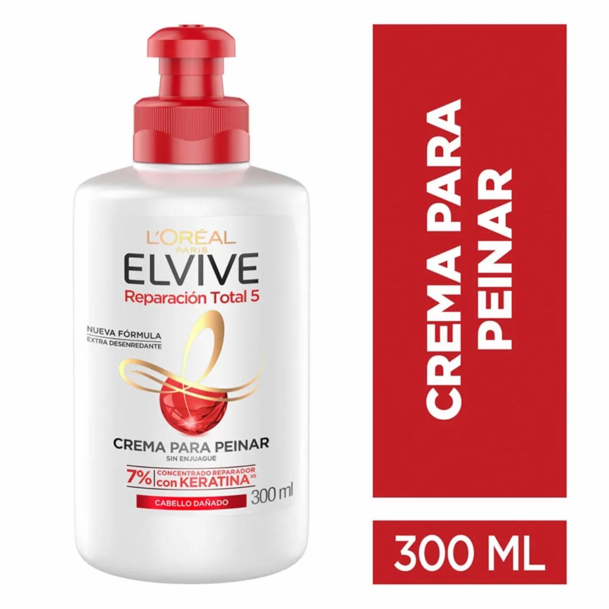 - Crema para peinar Elvive Reparación Total 5 con 7% de concentrado reparador con Keratina XS y sin sal para cabello dañado. Repara, fortalece y protege la fibra capilar, para transformar el cabello dañado en un cabello sedoso y brillante.