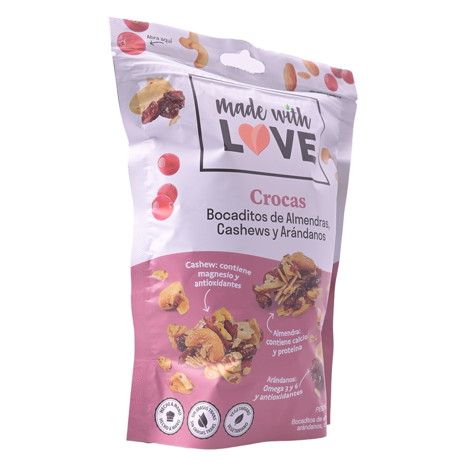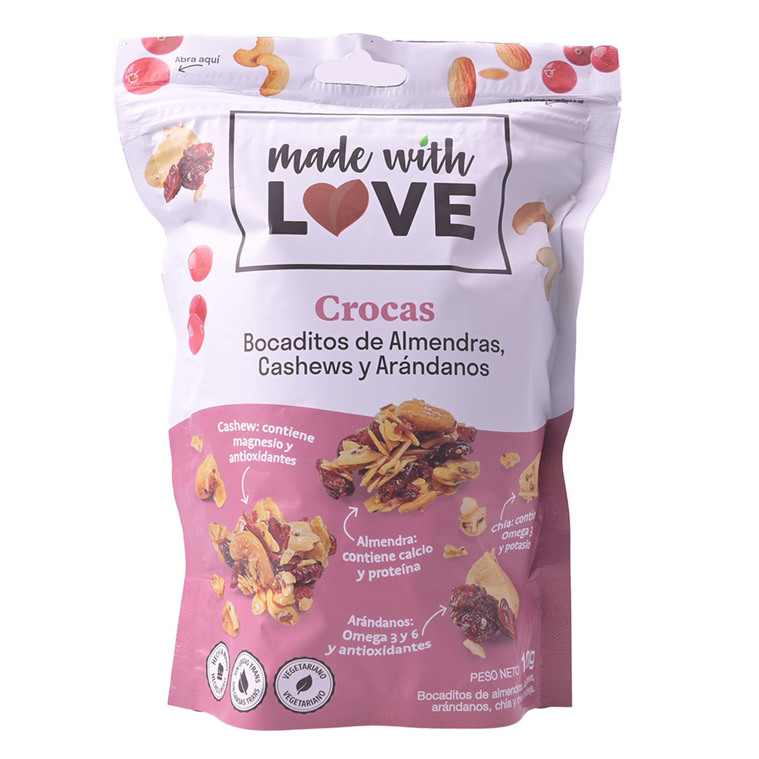 Crocas Bocaditos De Almendras, Cashews Y Arándanos MADE WITH LOVE 100 G – MADE WITH LOVE. Disponible en nuestros locales. Precio y stock pueden variar según la tienda.